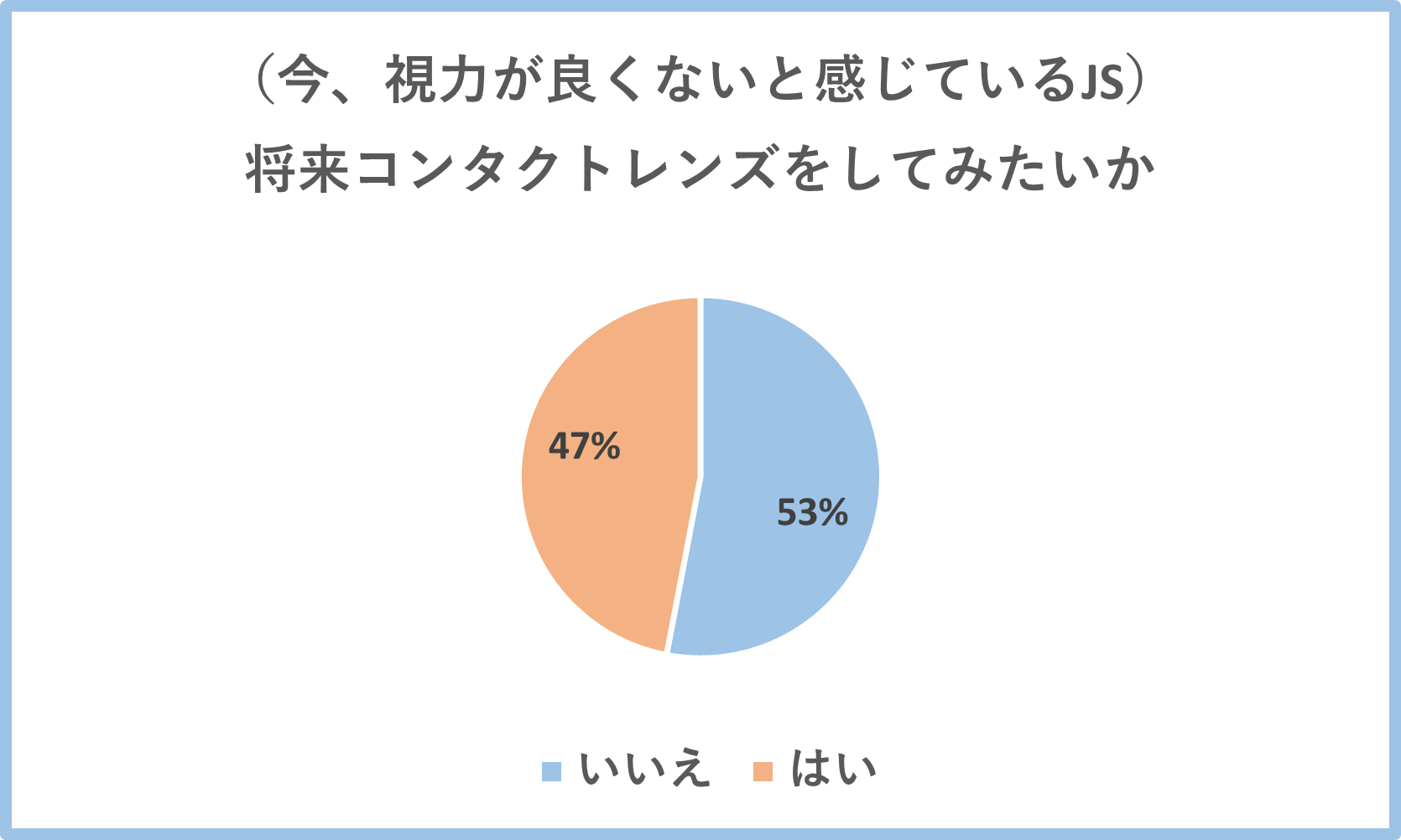 (今、視力がよくないと感じている人へ)「将来コンタクトレンズをしてみたい?」という質問に対しては、「いいえ」が52%に対して、「はい」と回答したJSも47%と約半数が将来的にはコンタクトレンズの使用を検討している様子です。