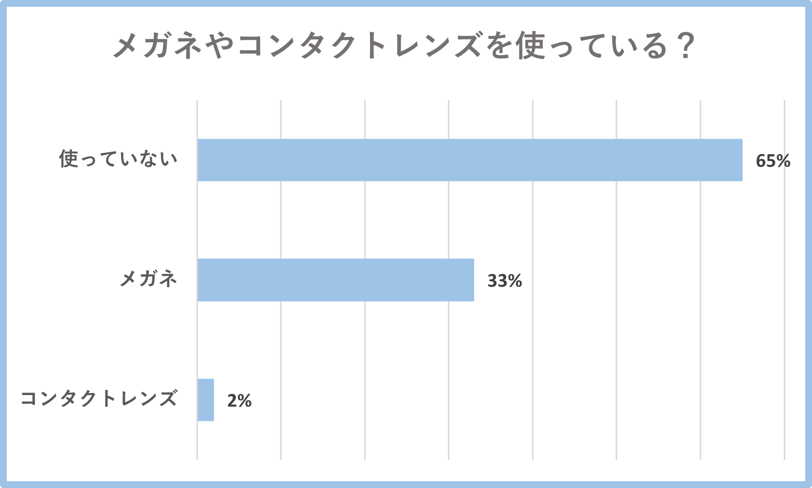 イマドキJSの3割以上が視力補正のためのメガネやコンタクトレンズを使用している実態が明らかになりました。そのうち、メガネ使用が33%、コンタクトレンズを使用している子が2%となっていて、コンタクトレンズを使用している子は限定的なようです。
