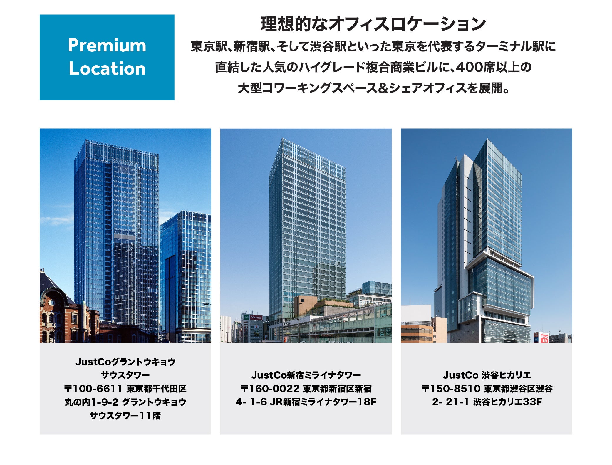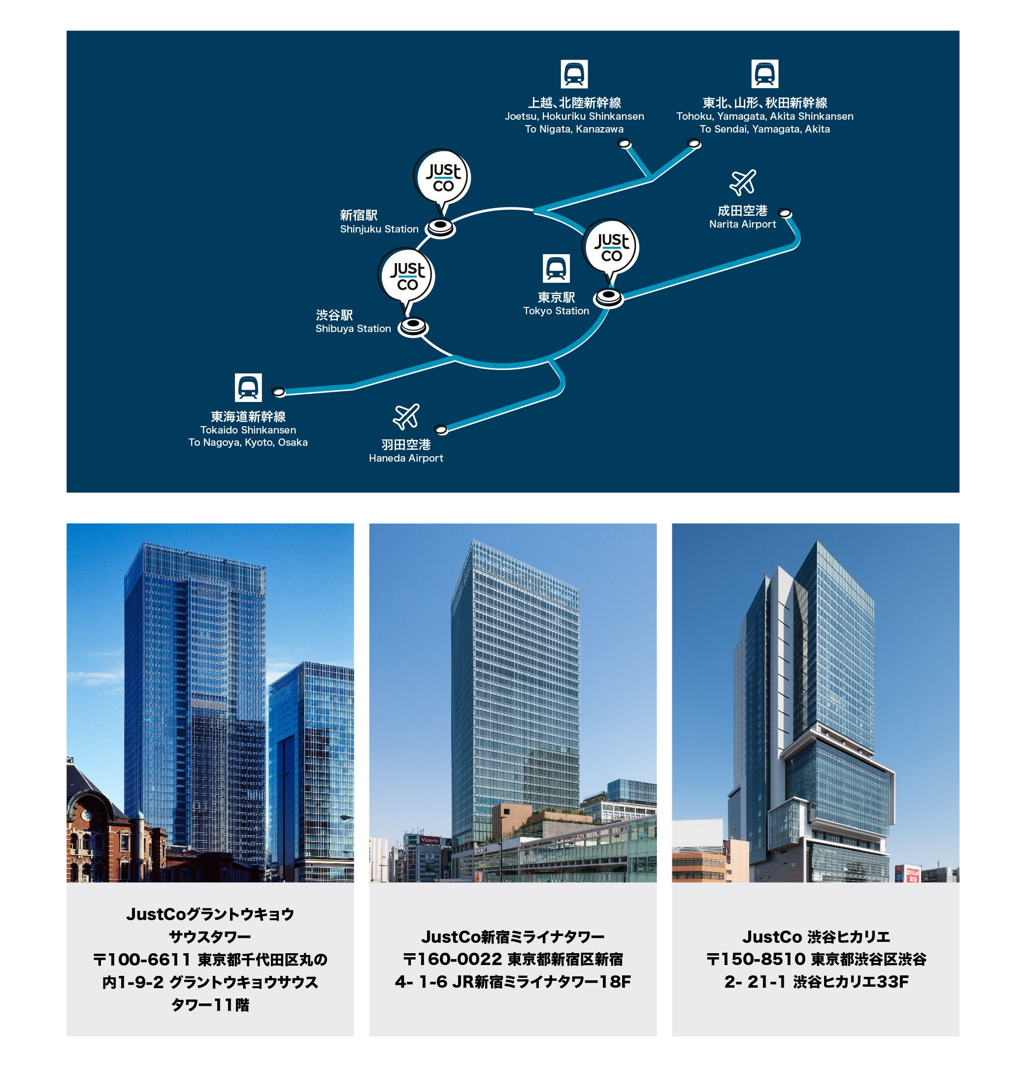 私たちJsutCoは、東京駅、渋谷駅、新宿駅といった都心の主要なターミナル駅に直結したハイグレードな複合商業ビルに、プレミアムさと快適さを融合した400席以上の大型コワーキングスペース&シェアオフィスを展開しています。SuperPassを活用いただくことで、従来の契約よりもリーズナブルな料金で、私たちのプレミアムコワーキングスペースをご利用いただけます。お見積もりやご見学など、お気軽にお問合せください。