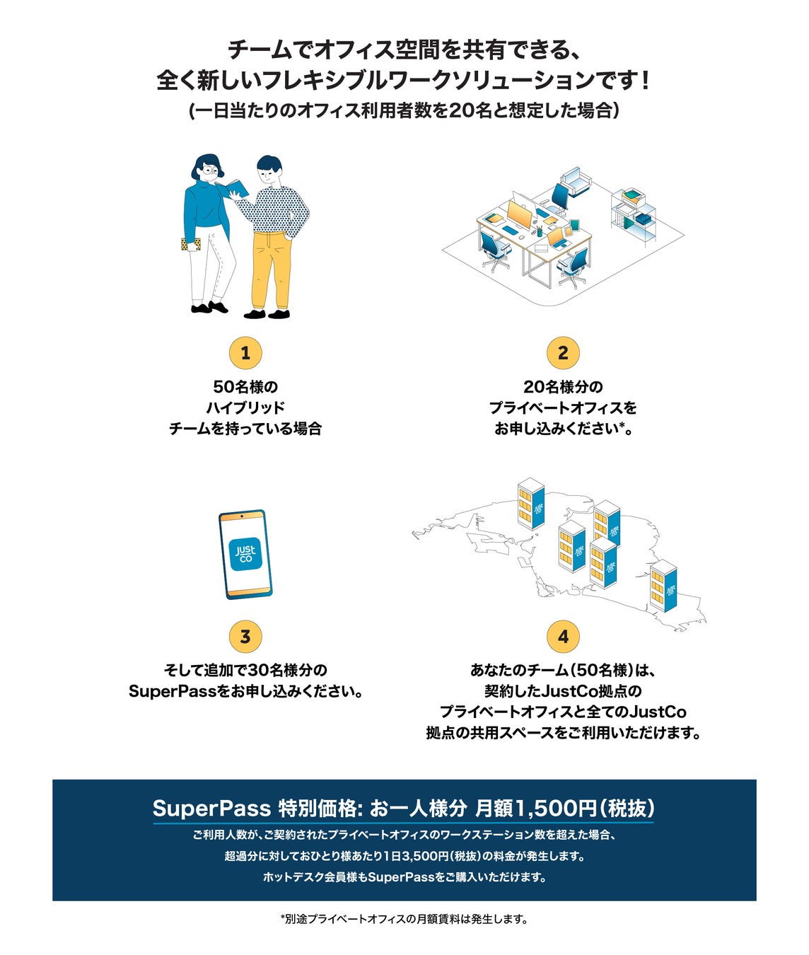 SuperPassをご利用いただくことで、従来のように社員全員分の席数を契約する必要はありません。例えば、出社型とテレワーク型の社員が混在する社員数50名の企業様が、20名席のプライベートオフィスを契約し、30名様分のSuperPassを月額1,500円(税抜)をご購入いただくと、50名の社員様全員が契約した拠点のプライベートオフィスと、東京4ヶ所、世界約40ヶ所のJustCo拠点の共有スペースをご利用いただけます。