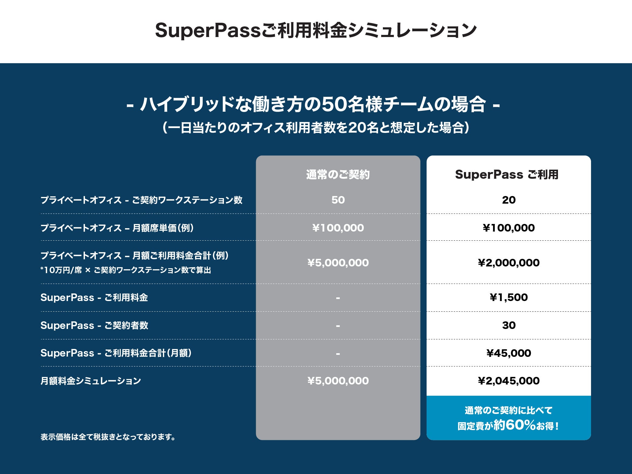 社員全員分の席数の契約が必要となる従来の契約と比較すると、SuperPassを利用することでプライベートオフィスの契約席数を抑えた分、毎月のオフィス固定費を削減することができます。例えば、前出した出社型とテレワーク型社員が混在するハイブリッド型の50名の企業が、プライベートオフィスを20名様席で契約し、SuperPassを30名様分購入した場合、毎月のご利用料金は、通常ご契約の料金に比べて約60%お得になります。