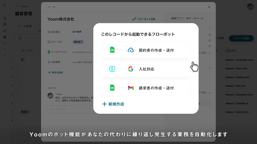 フローボット機能を使い、Yoomのデータベースに集約した情報を用いて繰り返し発生するワークフローを自動化することができます。契約書の作成と送付、新入社員の入社対応、毎月の請求書発行といった日々のワークフローを自動化します。