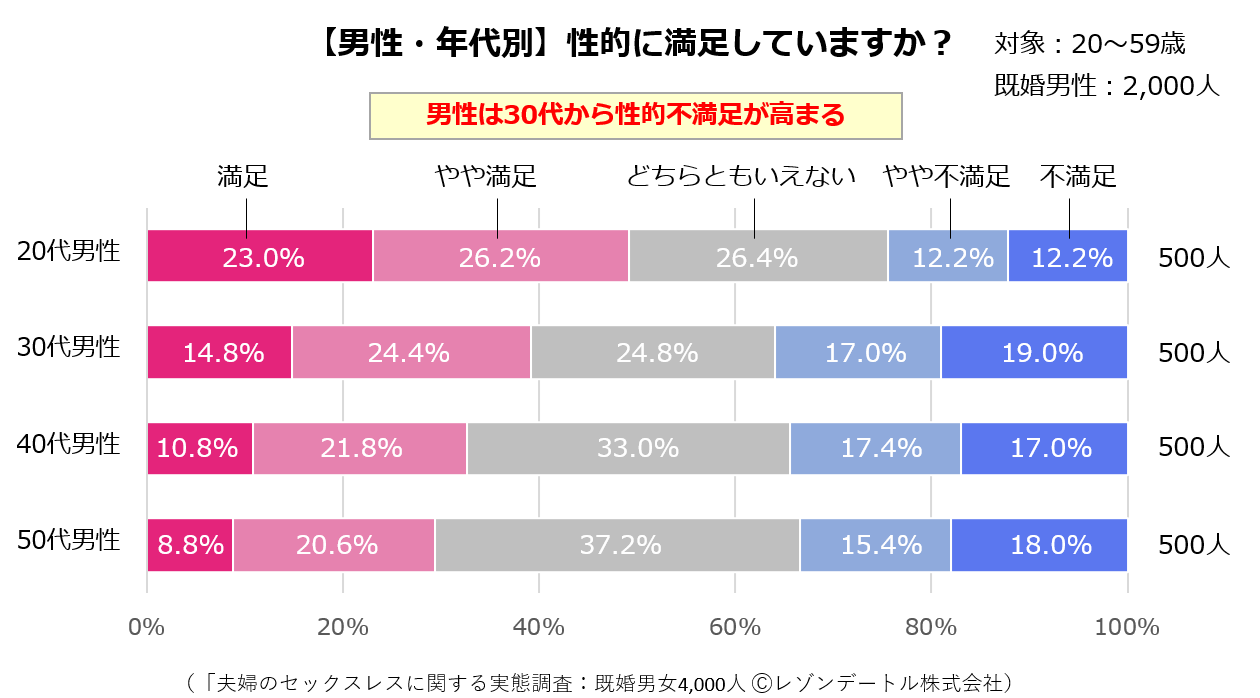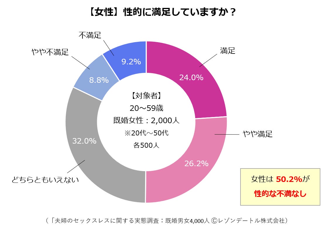一方、女性の場合は性的に不満を感じる割合が男性に比べて極端に低いことが分かります。30代で「不満足+やや不満足」が23.2%となりますが、それ以外はどの年齢層も不満を感じるのは約6人に1人という状態です。性に対する男女間の齟齬があらわれる結果となりました。