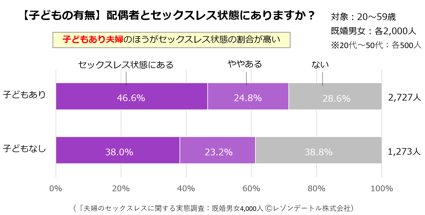 セックスレスの要因の一つに出産や子どもの成長があげられることは多いです。果たして、子どもの有無とセックスレスの割合は関係があるのでしょうか。