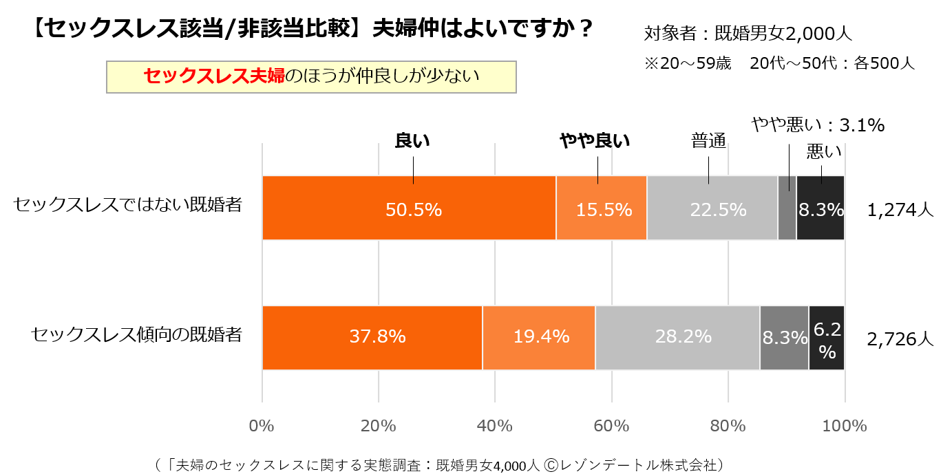 セックスレスと夫婦仲の関係は、どちらが原因か結果かという判別はできませんが、セックスレス状態の既婚者の方が「仲の良い夫婦がやや少ない」と言えるでしょう。