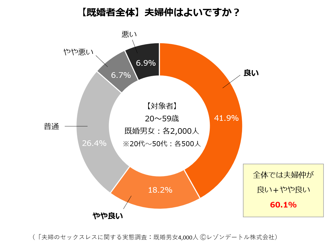 セックスは最高のコミュケーション、あるいは愛情表現などといわれます。そうだとするなら、セックスレス状態だと夫婦仲は悪い傾向があるのでしょうか。まずは回答者全体に夫婦仲を尋ねてみました。良い+やや良いが60.1%と、仲の良い夫婦が多いようです。回答者は年代がばらけた全国4,000人ですから、一般的な傾向をあらわしているでしょう。