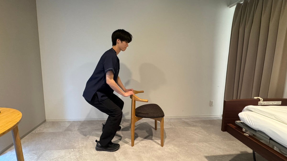 下半身の筋力トレーニングです。 背中が猫背にならないように背筋を真っすぐに保った状態で行いましょう。 膝はつま先より多少前に出てもOKです。
