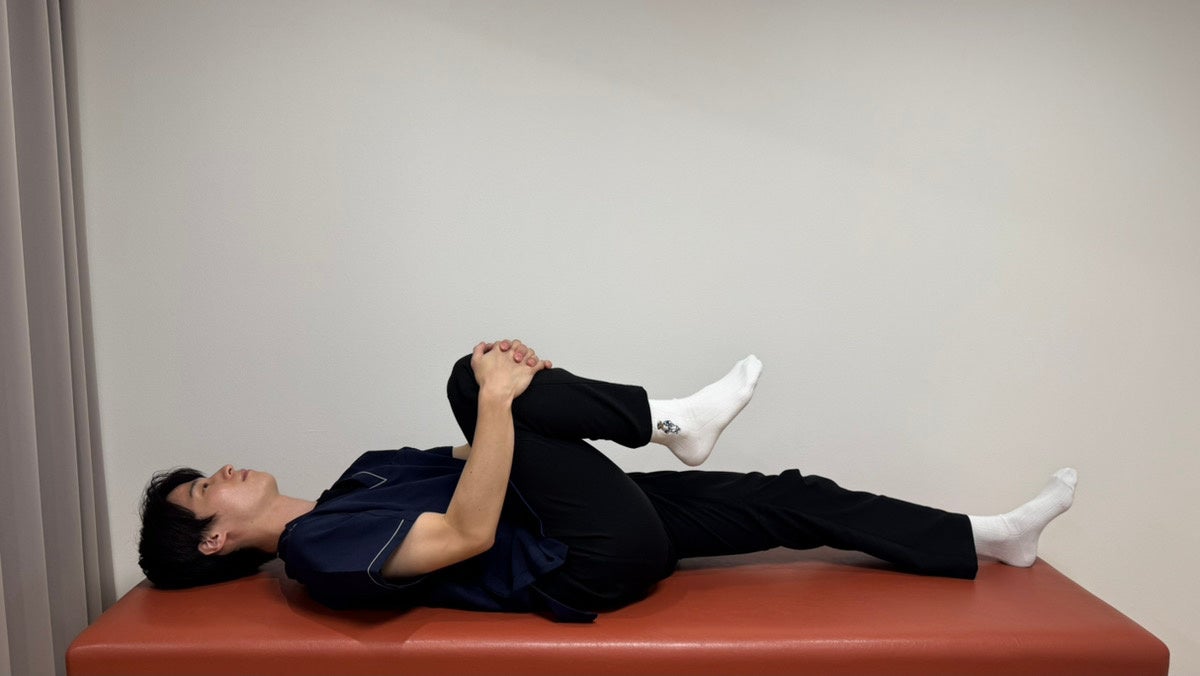 1.仰向けに寝て、息を吐きながら、片方の膝を胸に近づけるように抱えます