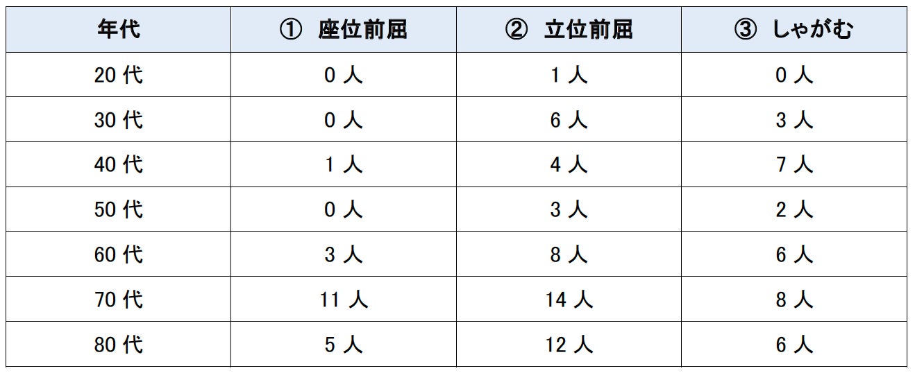 ①座位前屈> ②立位前屈> ③しゃがむ(腰を曲げない)