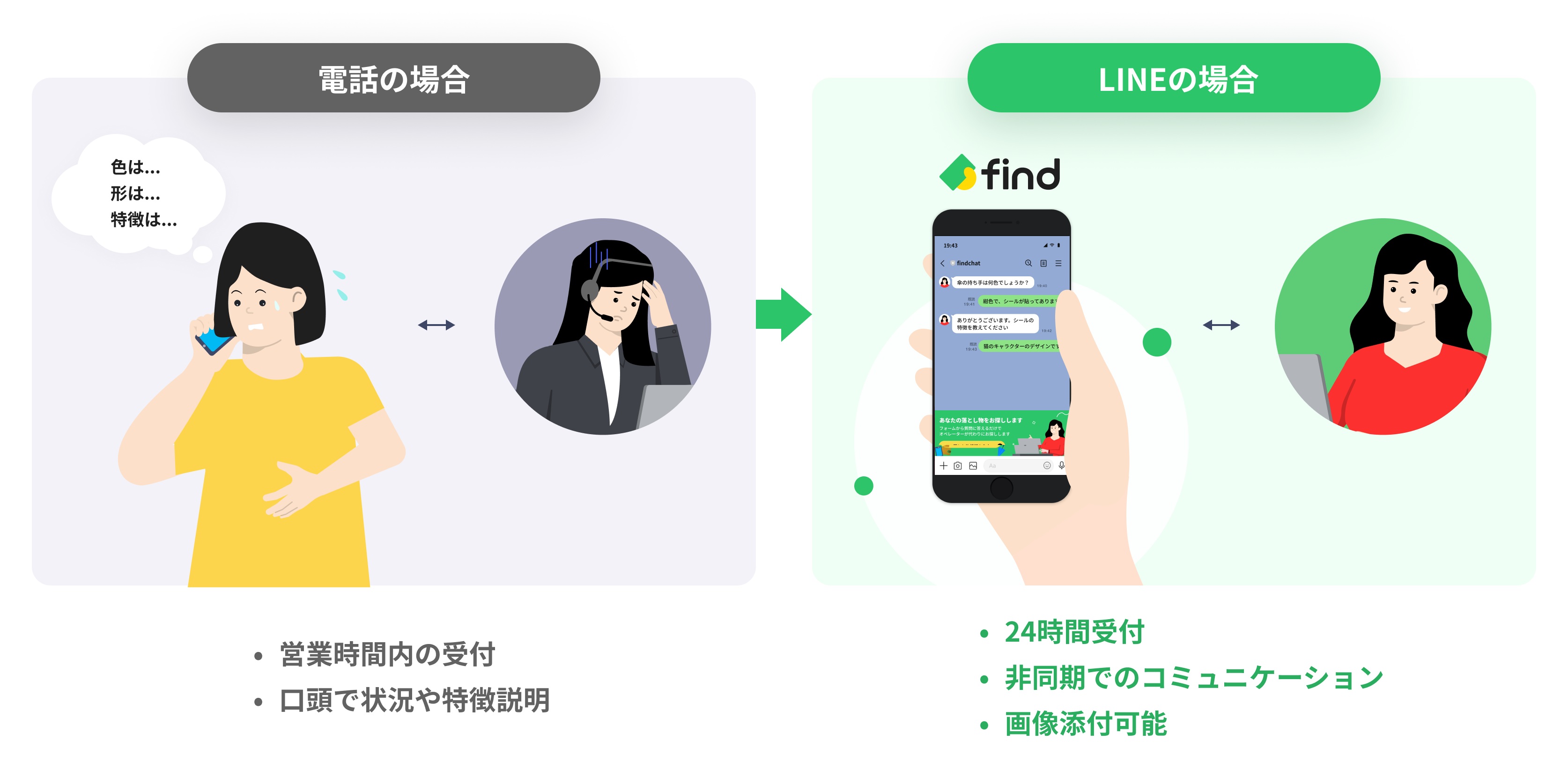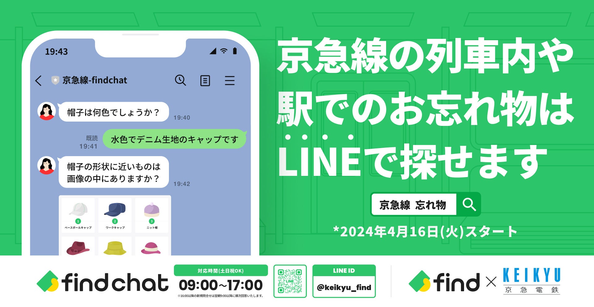 京急電鉄では、駅や列車内において毎年20万件近くのお忘れ物を取り扱っています。現行システムでは、電話でのお問い合わせに対し検索に時間を要することがありましたが、電話に変わりLINEで気軽にお問合せができ、AIを用いた高速検索システムにより、ストレスフリーなお問い合わせ実現のため,findの導入に至りました。