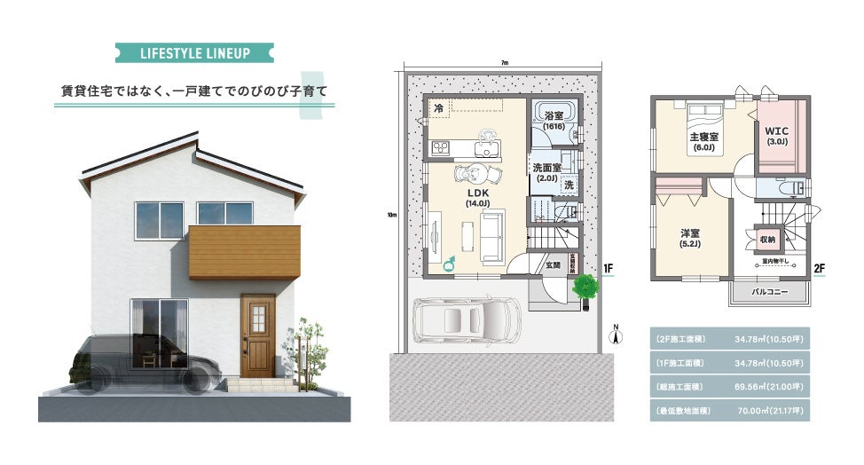 延床面積 :69.56㎡(21.00坪) 1階床面積:34.78㎡(10.50坪)/2階床面積:34.78㎡(10.50坪)