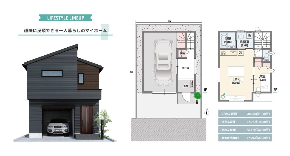 延床面積 :72.87㎡(22.00坪) 1階床面積:34.78㎡(10.50坪)/2階床面積:38.09㎡(11.50坪)