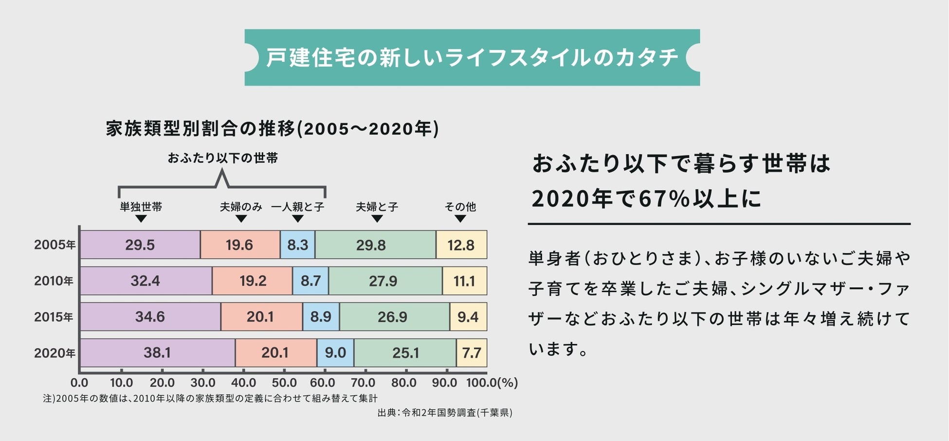令和2年度国勢調査[千葉県]によると、県内在住者の世帯人数は単身者および、お子様のいないご夫婦や子育てを卒業したご夫婦、ひとり親世帯(シングルファーザー・シングルマザー)など、“おふたり以下”の世帯は年々増え続けていることが見受けられます。