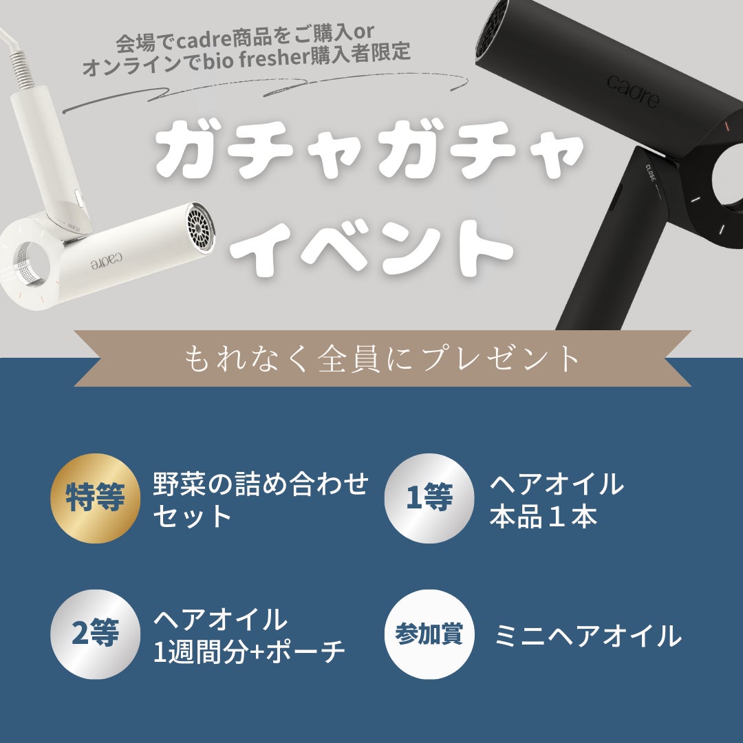 POPUP会場で商品をご購入いただいた方、もしくはMakuakeおよびオンラインでのbio fresher購入者はcadreオリジナルのガチャガチャイベントにご参加いただけます。みなさまのご来場お待ちしております!