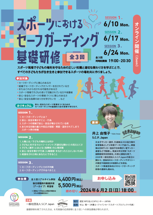 ⼀般社団法⼈S.C.P. Japan(以下「S.C.P. Japan」と表記)は、2020年の設立当初よりセーフガーディングの取り組みに力を入れ、あらゆるスポーツ現場で一人ひとりの人権が守られるよう、啓発活動や研修実施などを実施してきました。また、2022〜2023年の2年間はスミセイコミュニテイスポーツ推進助成を受けて、専門家の皆さまにご協力いただきながら、スポーツ組織向けのセーフガーディング研修(基礎編・応用編)のカリキュラム開発を行ってきました。この度、開発後初となるセーフガーディング応用研修の実施(2024年8月予定)に先立ち、6月に基礎研修を開催することとなりましたのでお知らせいたします。
