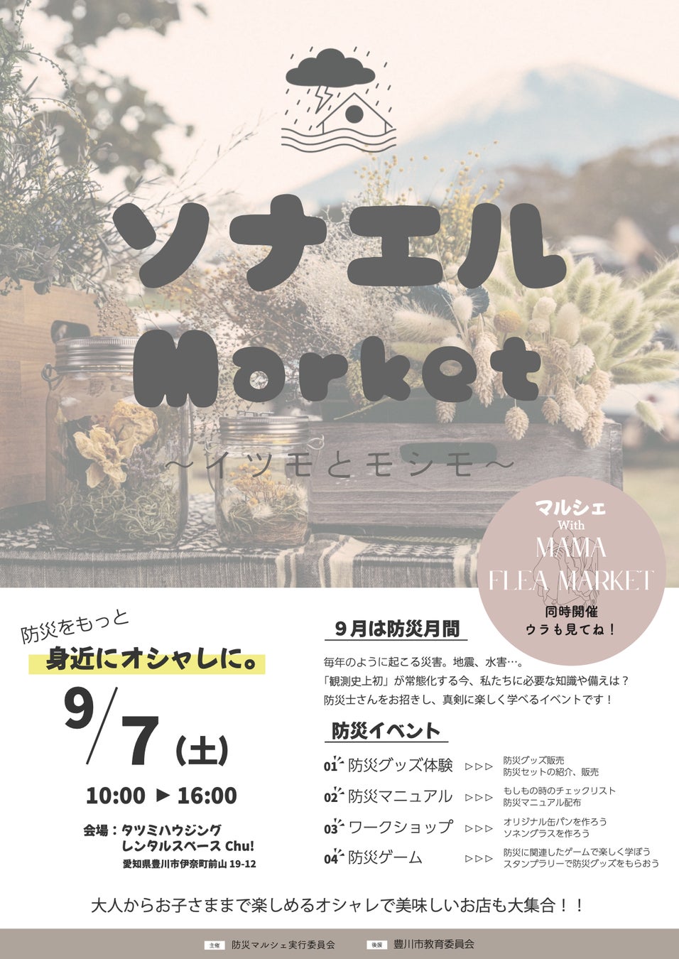 9月の防災月間に合わせて、9月7日(土)にタツミハウジングのレンタルスペース Chu!で「ソナエル Market ~イツモとモシモ~」を開催 人気イベント「MAMA FLEA MARKET」を同時開催