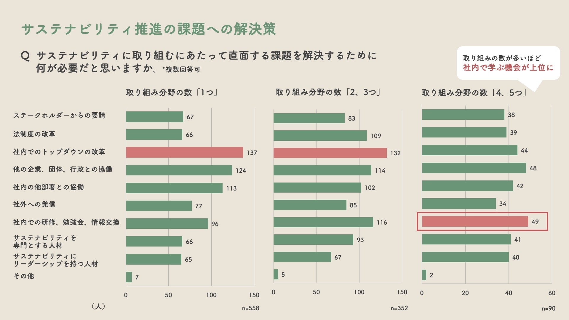 サステナビリティへの取り組み分野が少ない企業では、サステナビリティへの取り組みが進まないことに対する課題解決には、「トップダウンの改革が必要」と回答。一方で、取り組みが進んでいる先進企業では、トップダウンよりも社内の理解を広げる「社内での研修、勉強会、情報交換」が最も必要だとし、解決策に対する認識の違いも明らかになった。