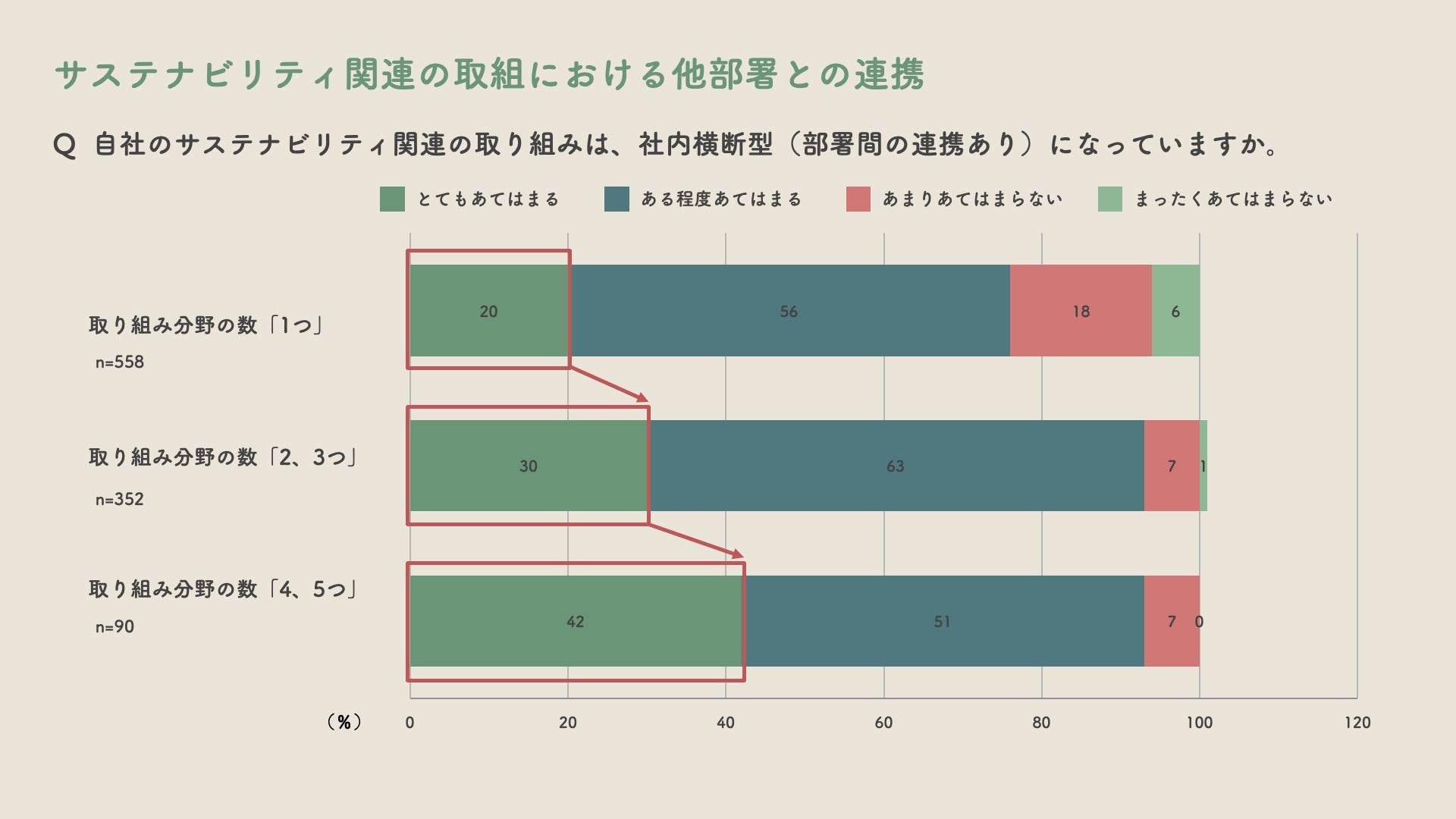 全回答者の83%は他部署との連携があるとしているが、より他部署との連携があるとする「とてもあてはまる」と回答する割合は取り組み分野の数が増えるほど増加。取り組み分野が一つだけの企業では20%だが、、取り組み分野が多い(4つ、5つ)企業ではその倍の42%が社内横断型に「とてもあてはまる」と回答。