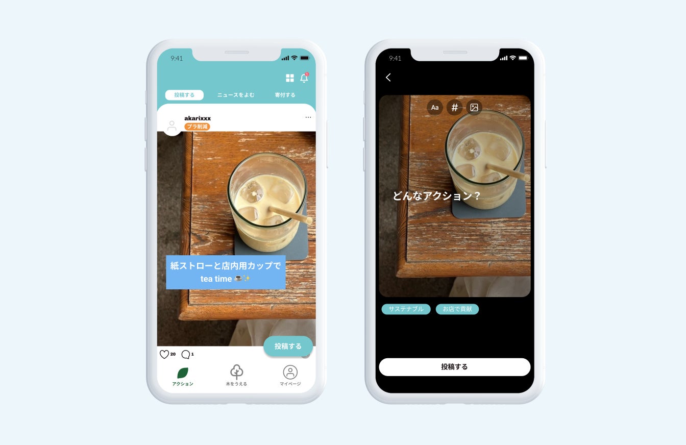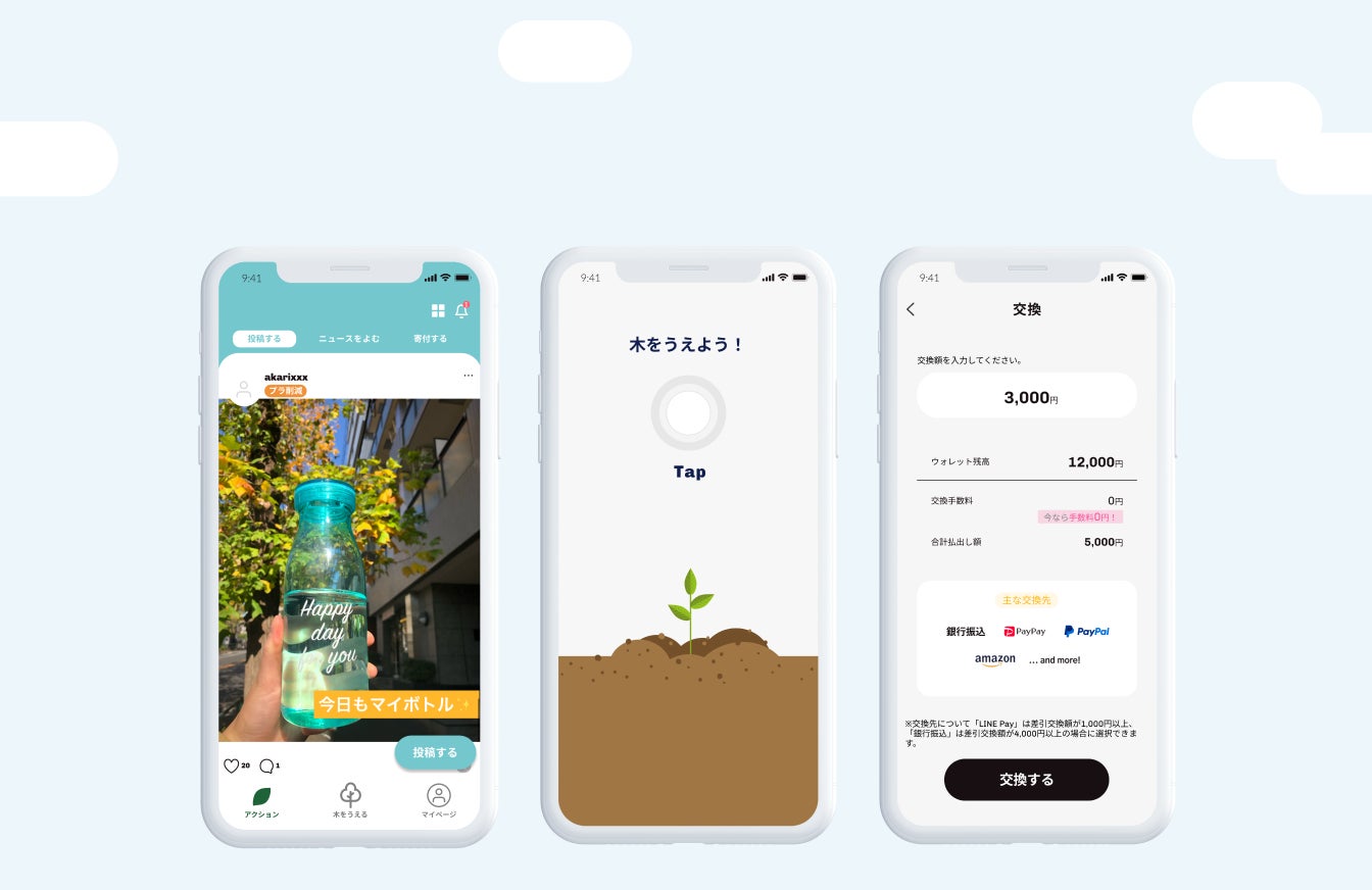 提供を開始した新サービスは、サステナブルなアクション(マイボトルの持参、見切り品の購入、節電など)をアプリ内に投稿すると、「木をうえる」ことができ、そのお礼としてユーザーは1本あたり100円分の報酬をその場でもらえるサービスです。ユーザーは報酬をもらいながらも、日々のサステナブルアクションと「木をうえる」ことによって環境・生物多様性の保護に貢献することができます。なお、報酬はPayPayやAmazonギフト券などと交換可能です。
