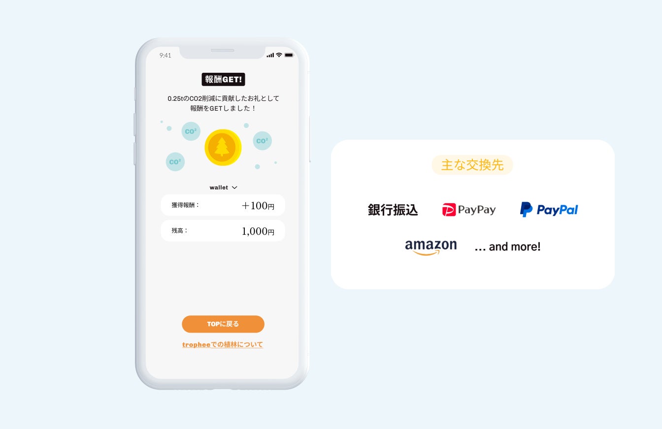 木をうえたあと、そのお礼として、1投稿につき100円分の報酬を受け取ることができます。貯まった報酬は銀行振込のほか、PayPayやAmazonギフト券などへ交換可能です。