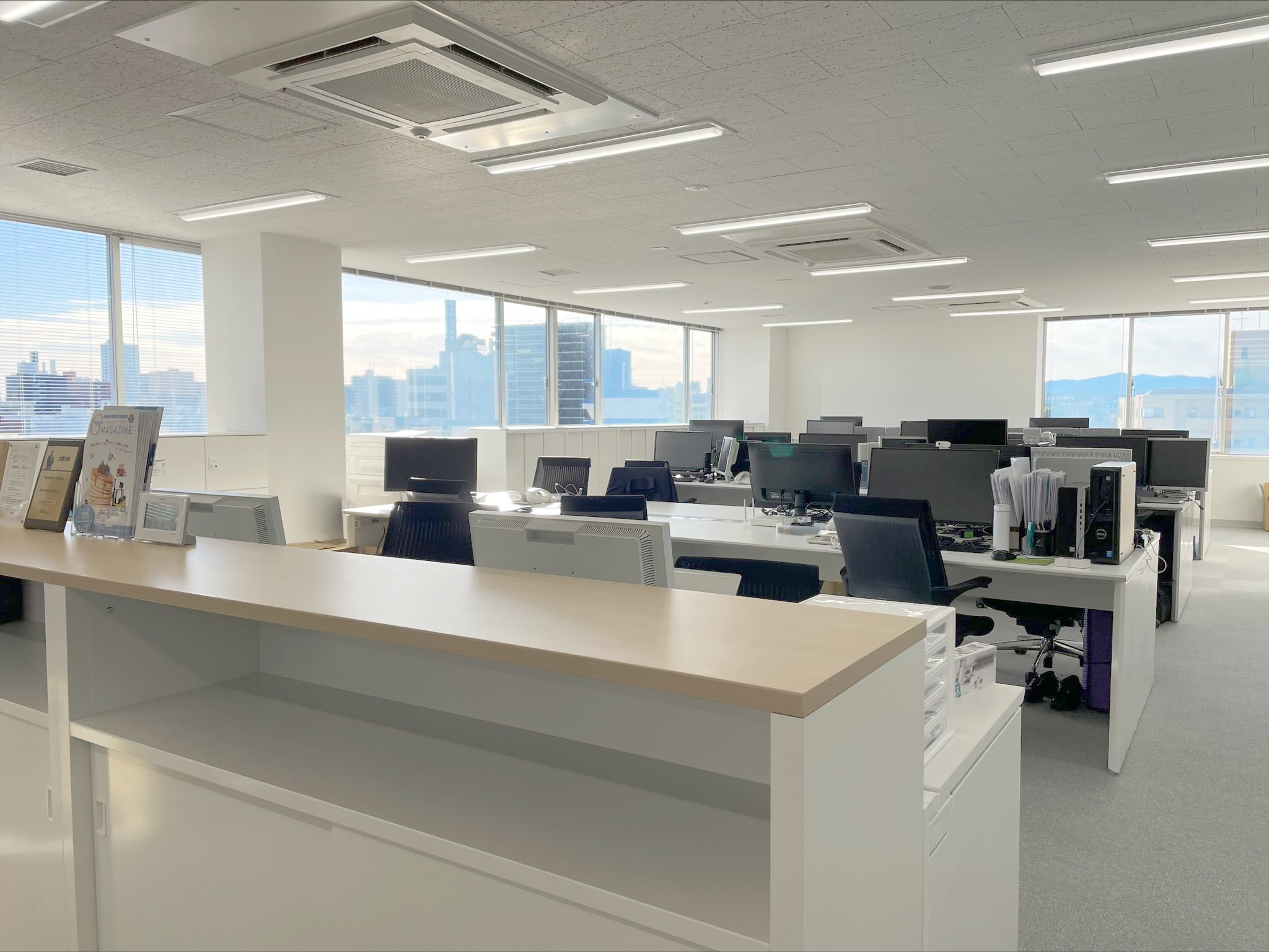 今回の移転で職場環境を改善し、従業員が新しい発想や新たな技術への挑戦がしやすい環境をつくります。部署の垣根をこえたコミュニケーションを促進し、社内の風通しを良くする狙いで2フロアを1フロアに統合し、座席を固定しないフリーアドレス制を採用しました。新オフィスは54.48坪で会議室・サーバールーム・ミーティングスペースが各1室ずつあります。
