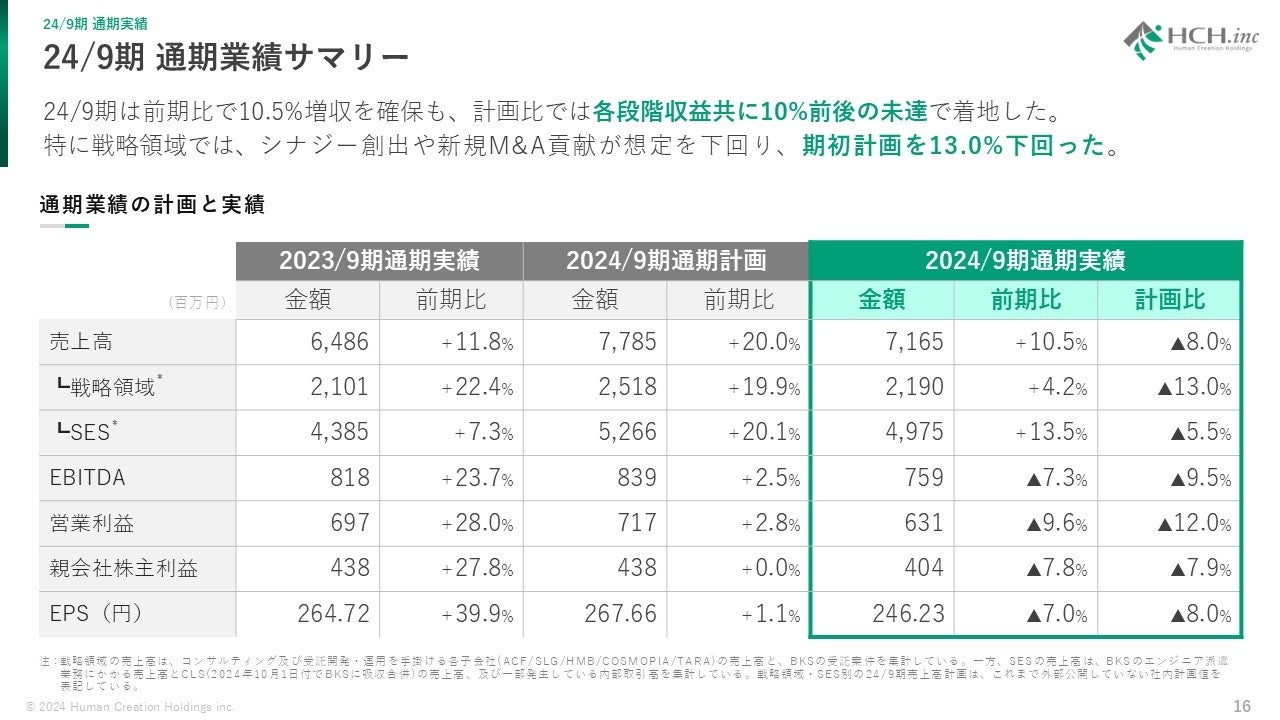 24/9期通期の売上高においては、7,165百万円(前期比+10.5%、計画比-8.0%)EBITDAは759百万円(前期比-7.3%、計画比−9.5%)、EPSは246.23円(前期比-7.0%、計画比−8.0%)となりました。