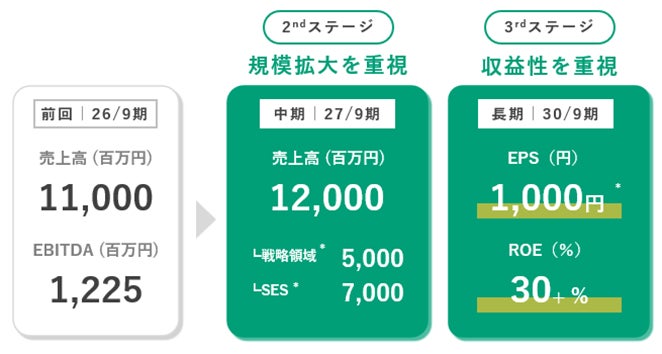 計数計画につきましては、2ndステージ最終年度にあたる27/9期は、M&Aを含む積極投資による規模拡大と事業構造の転換をテーマに、売上高12,000百万円を実現いたします。戦略領域の成長を重視し、売上高は5,000百万円とし、うち3,000百万円をM&Aによる効果と想定しております。3rdステージは、投資回収とシナジー創出に重きを置き、最終年度である30/9期に、EPS1,000百万円(24/9期比4.0倍)と、ROE30%超にこだわります。