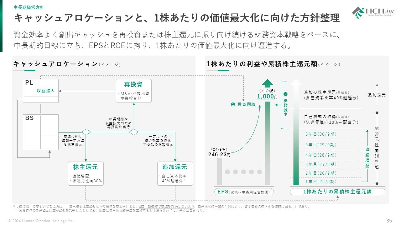 大前提として、持続的成長に向けた再投資を優先する方針ですが、①資金効率の良化と、②株主の期待に応えるため、仮に充分な投資機会(M&A等)に恵まれず、4四半期連続で自己資本比率が40%を超過することが見込まれる場合には、40%を超過する自己資本を原資に追加的な株主還元(自己株式取得等を含む)を実施することで、随時、資本構成の適正化を図ることと致しました。なお、直近2四半期は自己資本比率40.0%を超過(24年6月末は41.3%、同9月末は44.8%)しており、25年3月末までの2四半期以内に資本構成の適正化が必要な状況にあります。