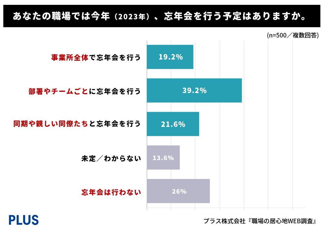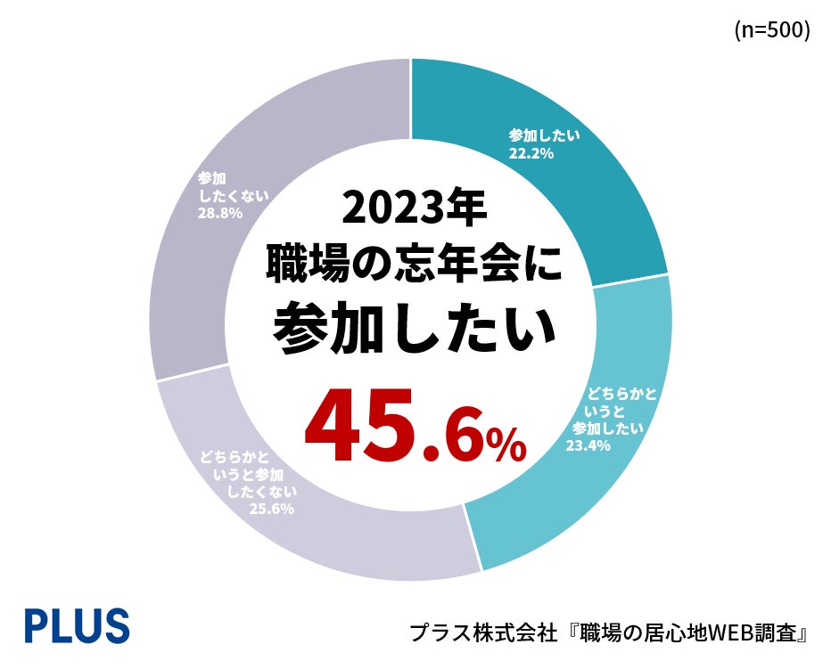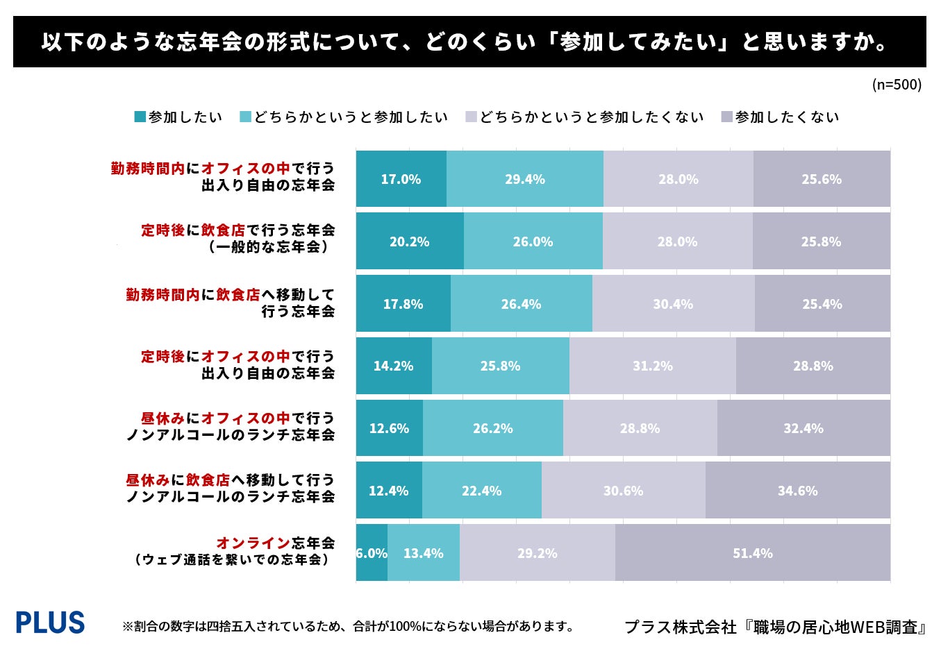 プラス株式会社ファニチャーカンパニー(東京都渋谷区)は、『職場の居心地WEB調査』と題し、デスクワーク中心の業務を行う会社員・公務員500名を対象に「職場の忘年会」についてのWEB調査を実施いたしました。その調査結果を発表いたします。