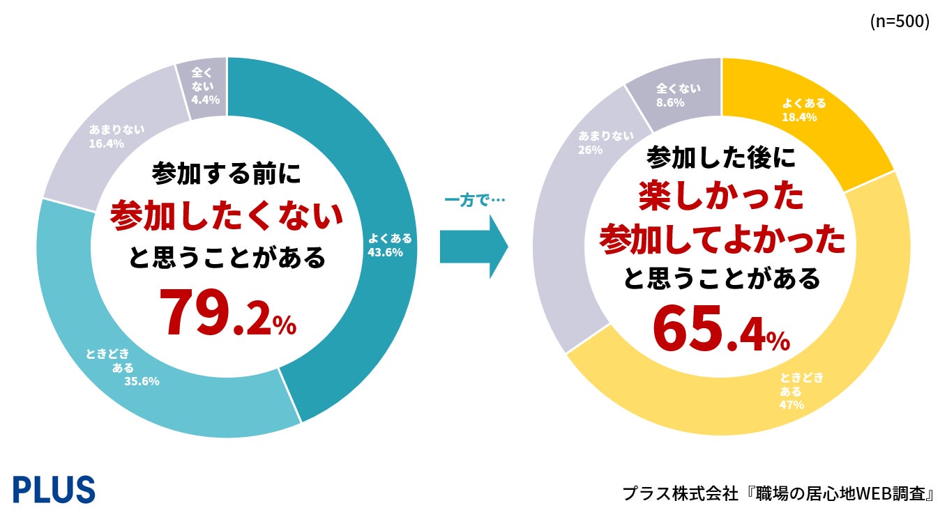 参加する前に「面倒だ」「参加したくない」と思う人は79.2%いる一方、参加した後に「(思ったよりも)楽しかった」「参加してよかった」と感じる人は65.4%。