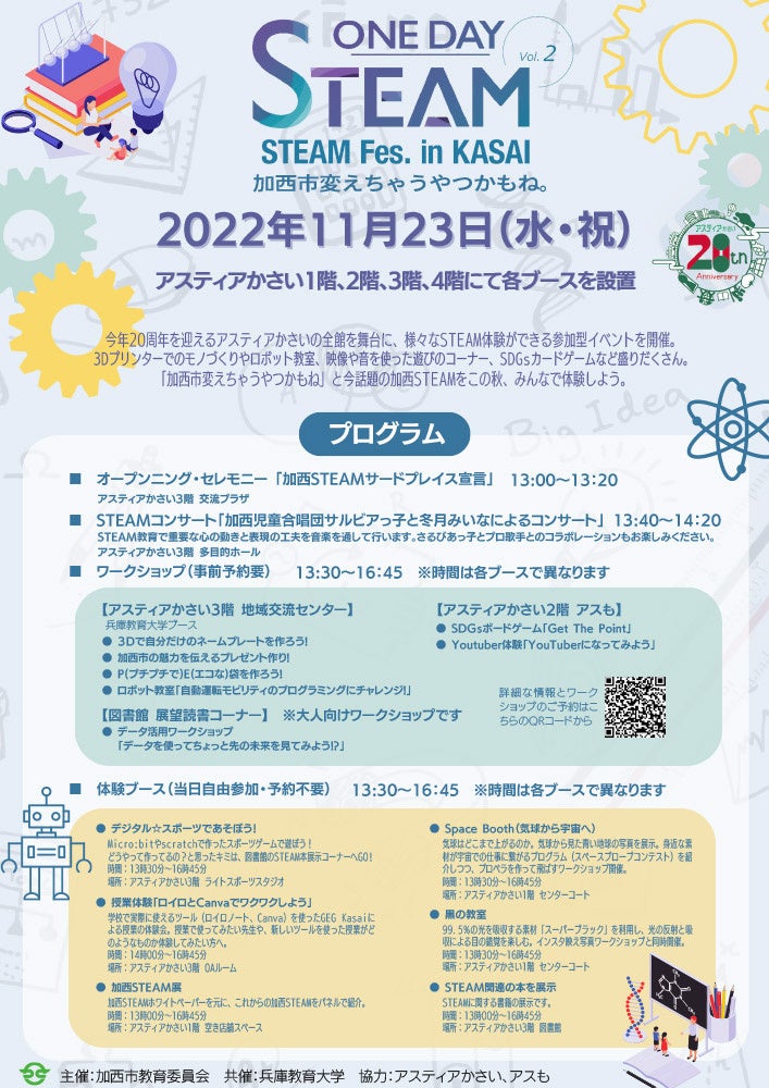 今年20周年を迎える「アスティアかさい」を舞台に、2023年11月23日(水・祝)様々なSTEAM体験ができる参加型イベント「第2回加西STEAMフェス」を開催します!