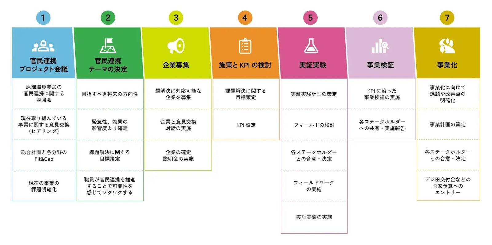 地域住民の課題意識を理解している行政職員による地域課題や事業課題の洗い出しから、課題解決に向けた企業を募集するテーマの選定、当初予算での実証実験費用の捻出、企業募集を行った上で実証実験を行い、事業化までを行う一連の流れのプロセスをパッケージにした国内初の試みとして展開しています。