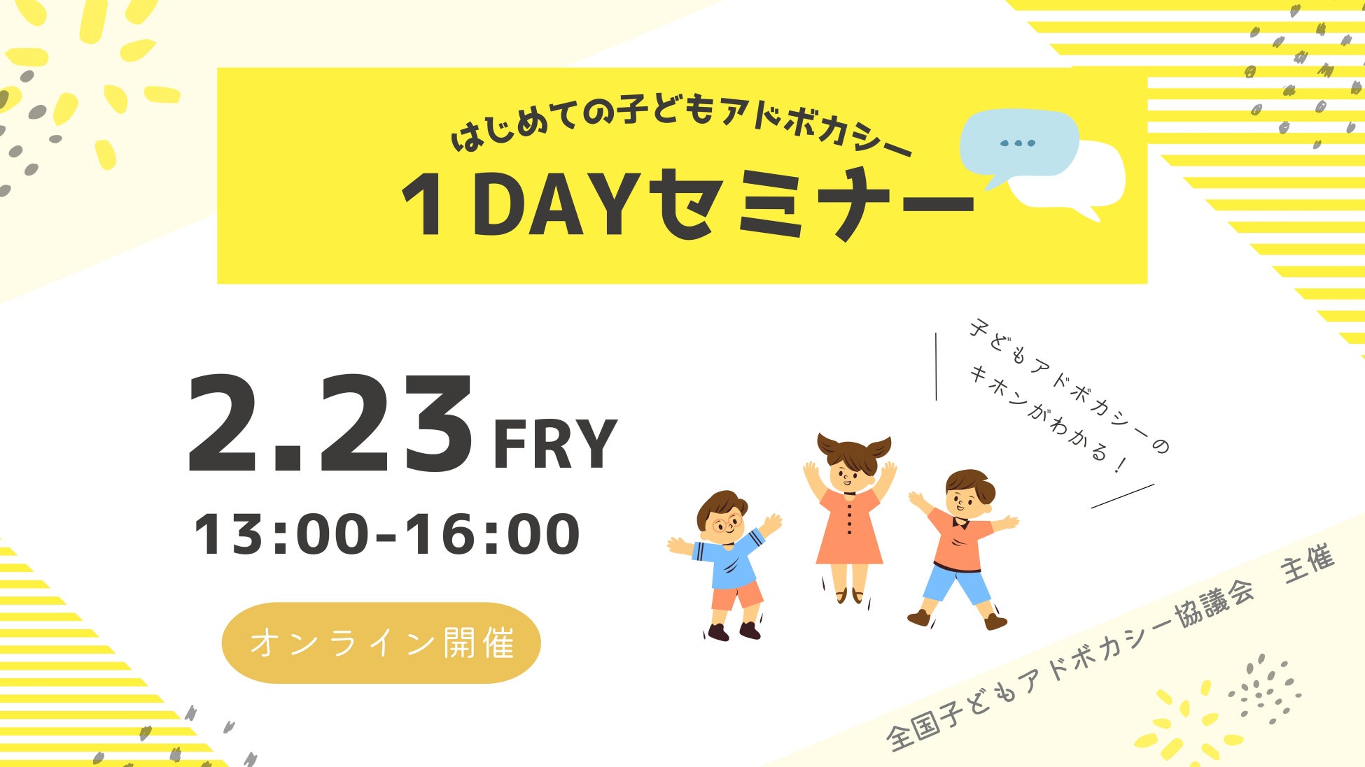 NPO法人全国子どもアドボカシー協議会(所在地:福岡県福岡市中央区、理事長:相澤 仁)は、2/23(金)に「1DAYセミナー 〜はじめての子どもアドボカシー〜」をオンラインで開催します。このセミナーは、子どもアドボカシーを気軽に多くの方に知っていただくため、弊団体の「子ども・若者委員会」が企画しました。2024年4月の改正児童福祉法施行によって、社会的養護の分野で子どもの声を聴く制度が本格的に導入されますが、本セミナーは、子どもアドボカシーの基本的な理念や必要性の理解促進を目指しています。