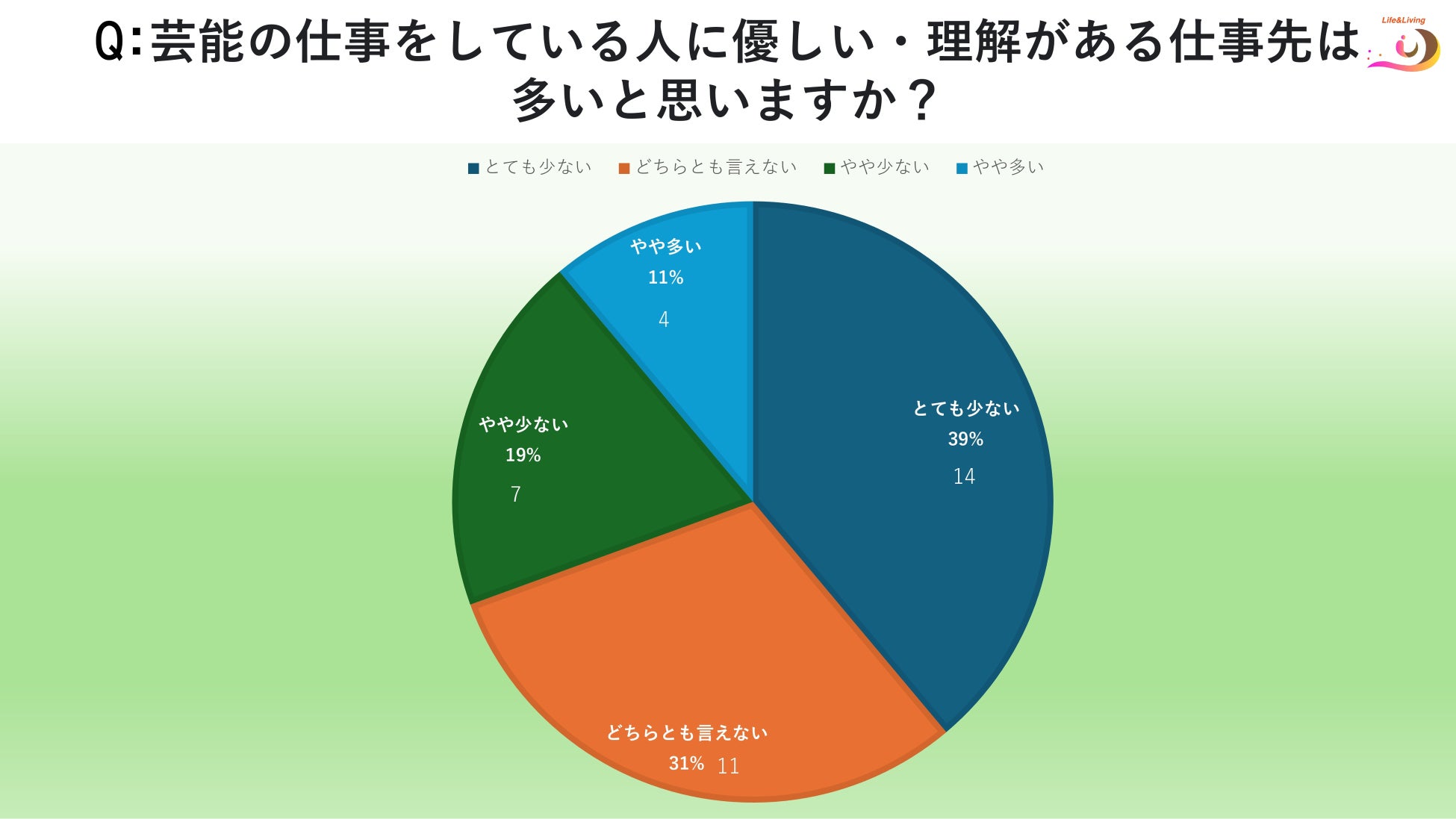 約4割が「とても少ない」と回答。「どちらとも言えない」・「やや少ない」も合わせると、約8割が「理解がある仕事先は多くはない」と実感を抱いていることがわかる結果になった。現代の日本の見えない課題と芸能関係の仕事をする人に対する周囲の理解の少なさも垣間見える結果であった。