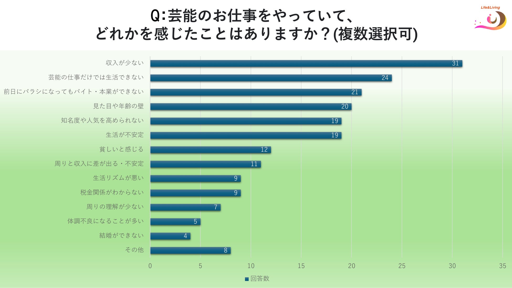 「収入が少ない」が全体の8割を超える結果になった。更に、「芸能の仕事だけでは生活できない」・「生活が不安定」など生活面や収入面での実感が多くあった。本業やバイトの掛け持ちをせざるをえない・しながら活動する人は非常に多い。「生活面」のフォローは言うまでもなく、社会に求められている課題であると弊社は考えている。