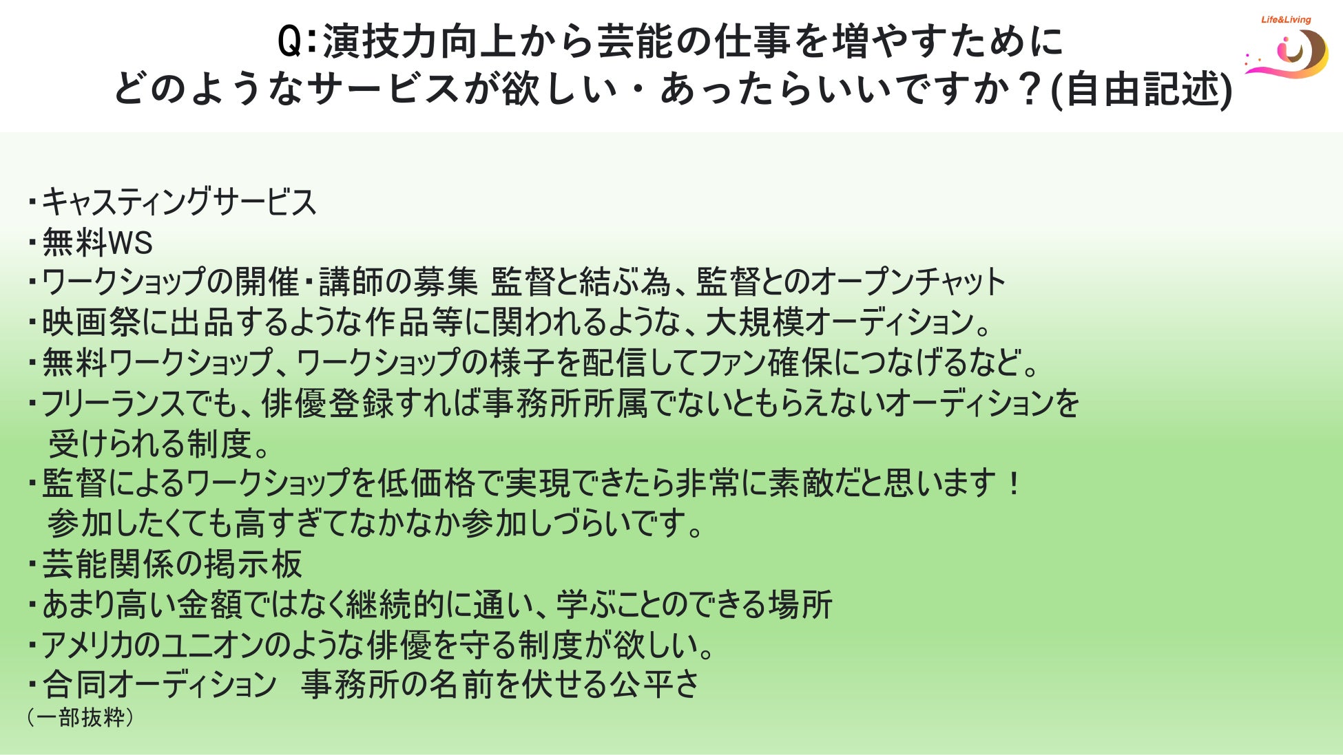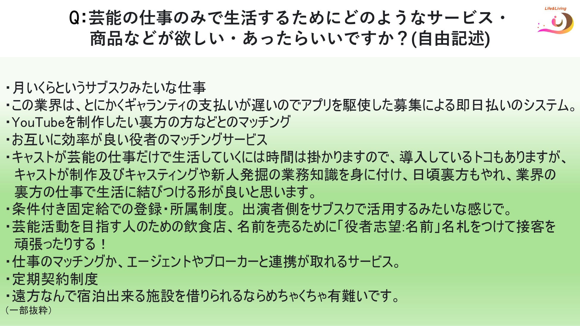 自由記述で芸能の仕事のみで生活するために欲しいサービス・商品などを尋ねた。すると、数々の面白い意見が出た。「サブスクのように役者を出演させることができる」アイディアや「裏方の仕事のマッチ」、「定期契約制度」などの意見が挙がった。本来は業界側が考え、改善しなければいけないことのはずだが、役者側のこのような想いを、映像業界・関係者がどれだけ受け取れるかが肝になるだろう。