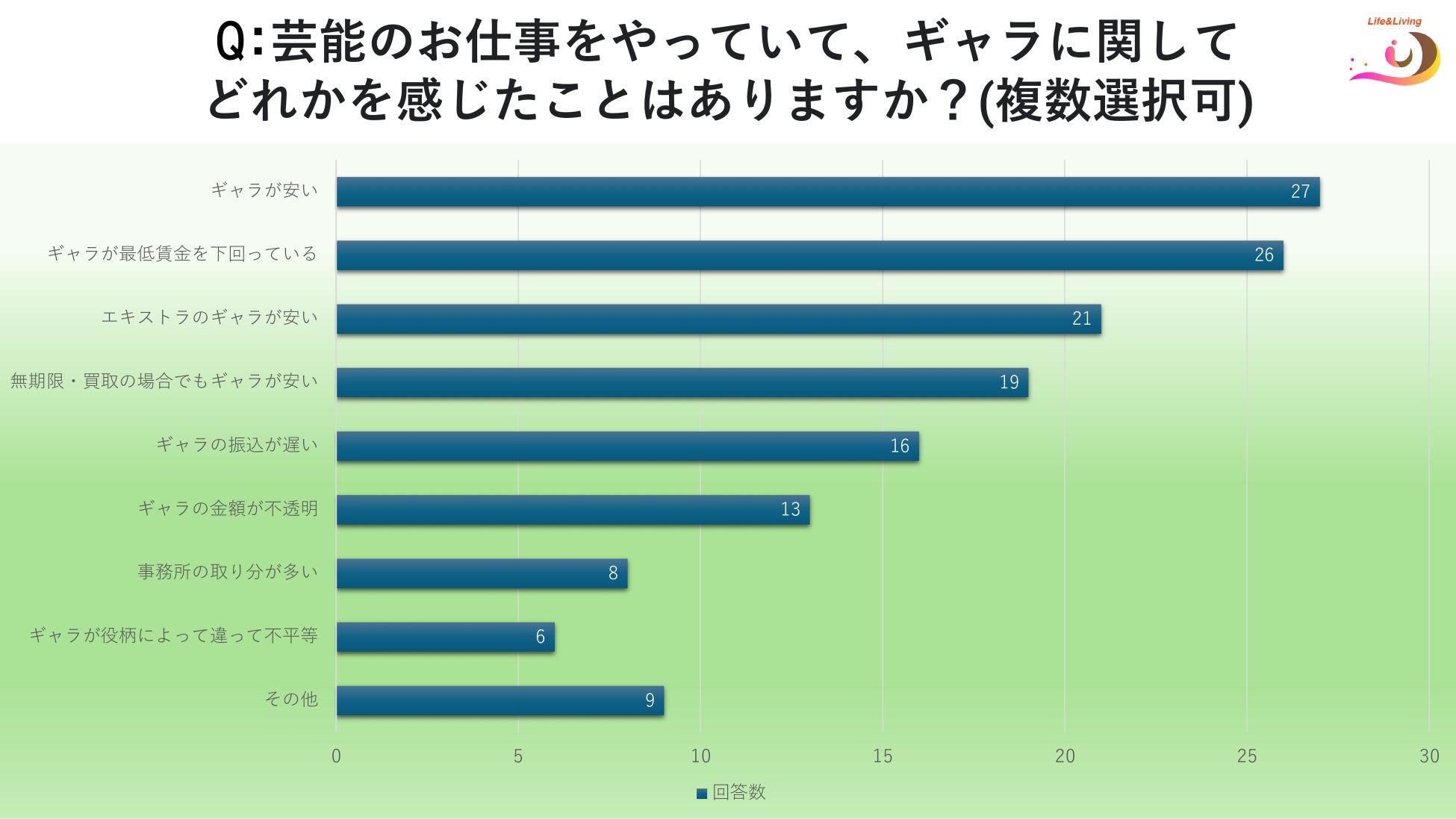 「ギャラが安い」はもちろん、「ギャラが最低賃金を下回っている」や「エキストラのギャラが安い」などの「給与面の低さ」の実感が非常に多いことがわかる結果となった。