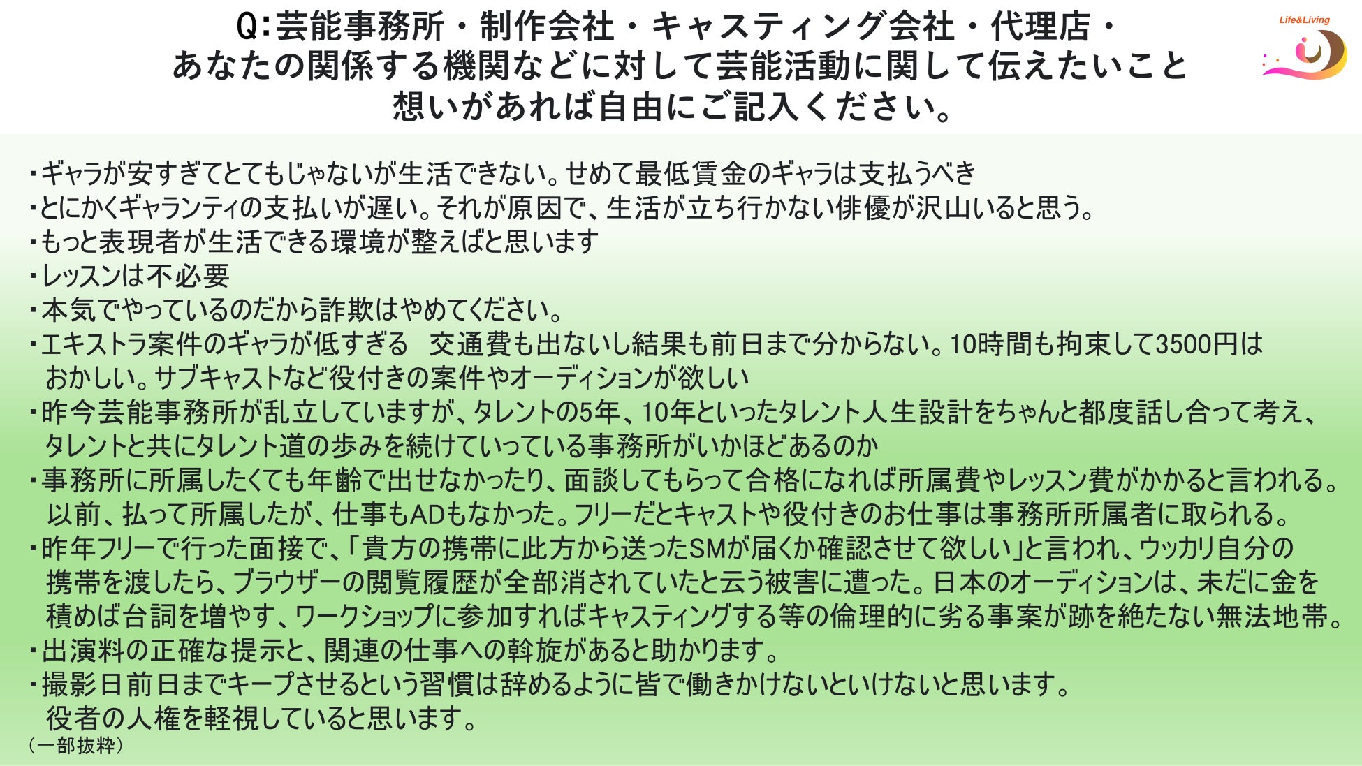 最後に、業界に対する芸能活動に関して伝えたいことや想いを聞いた。その結果、ギャラの低さに言及する声から詐欺被害の告発、フリータレントの地位の低さの指摘や芸能ビジネスの指摘が目立った。