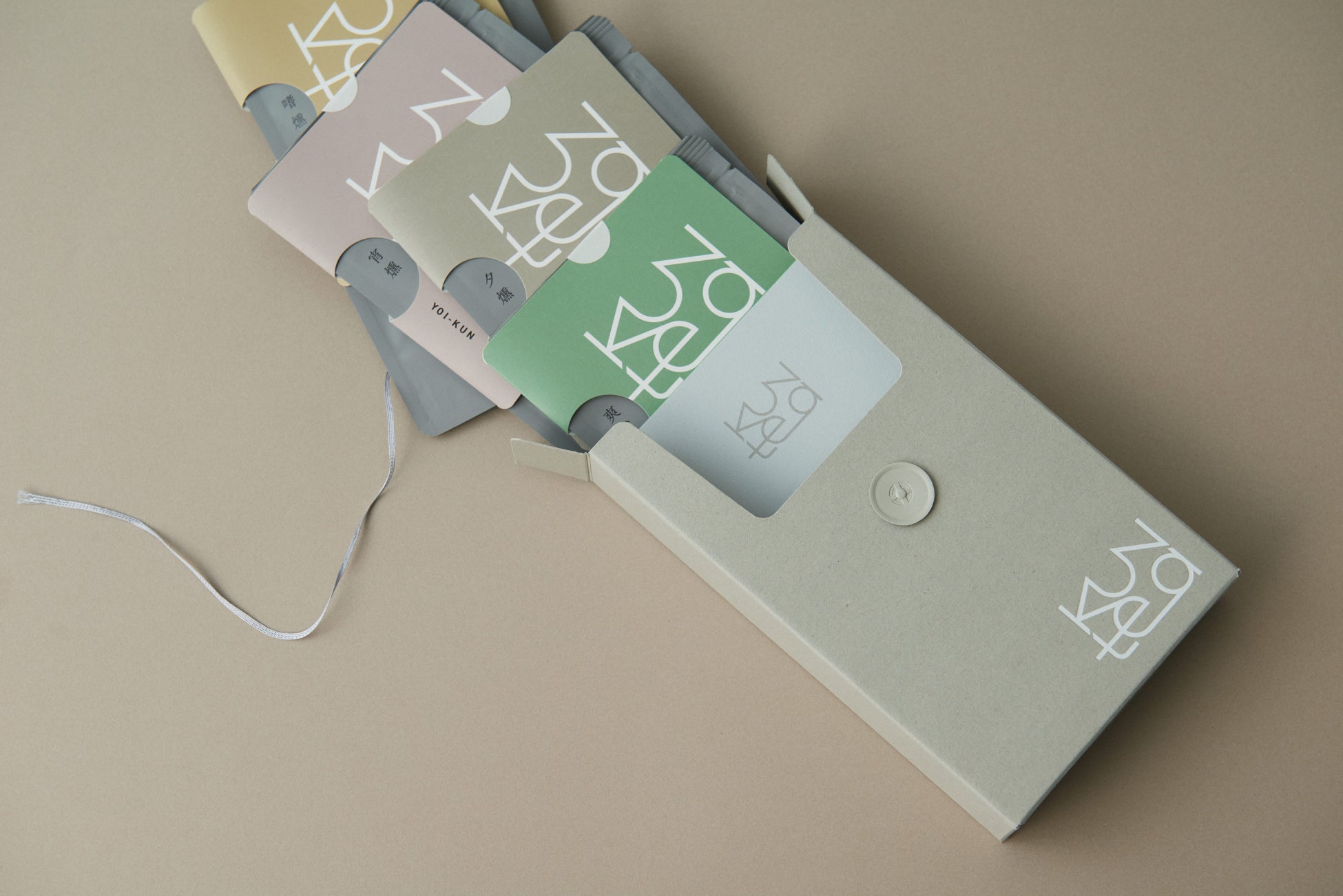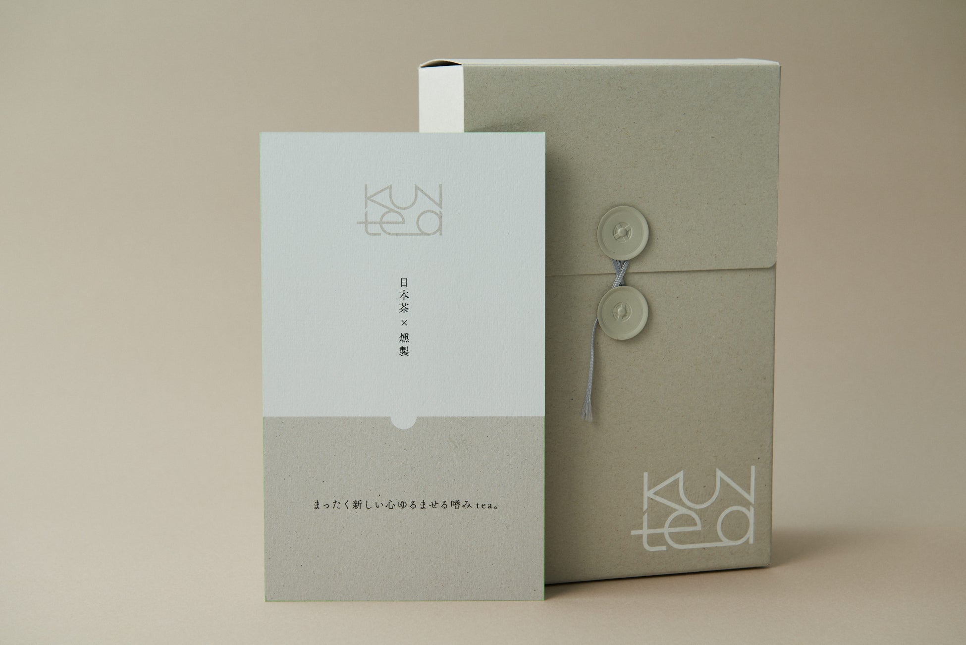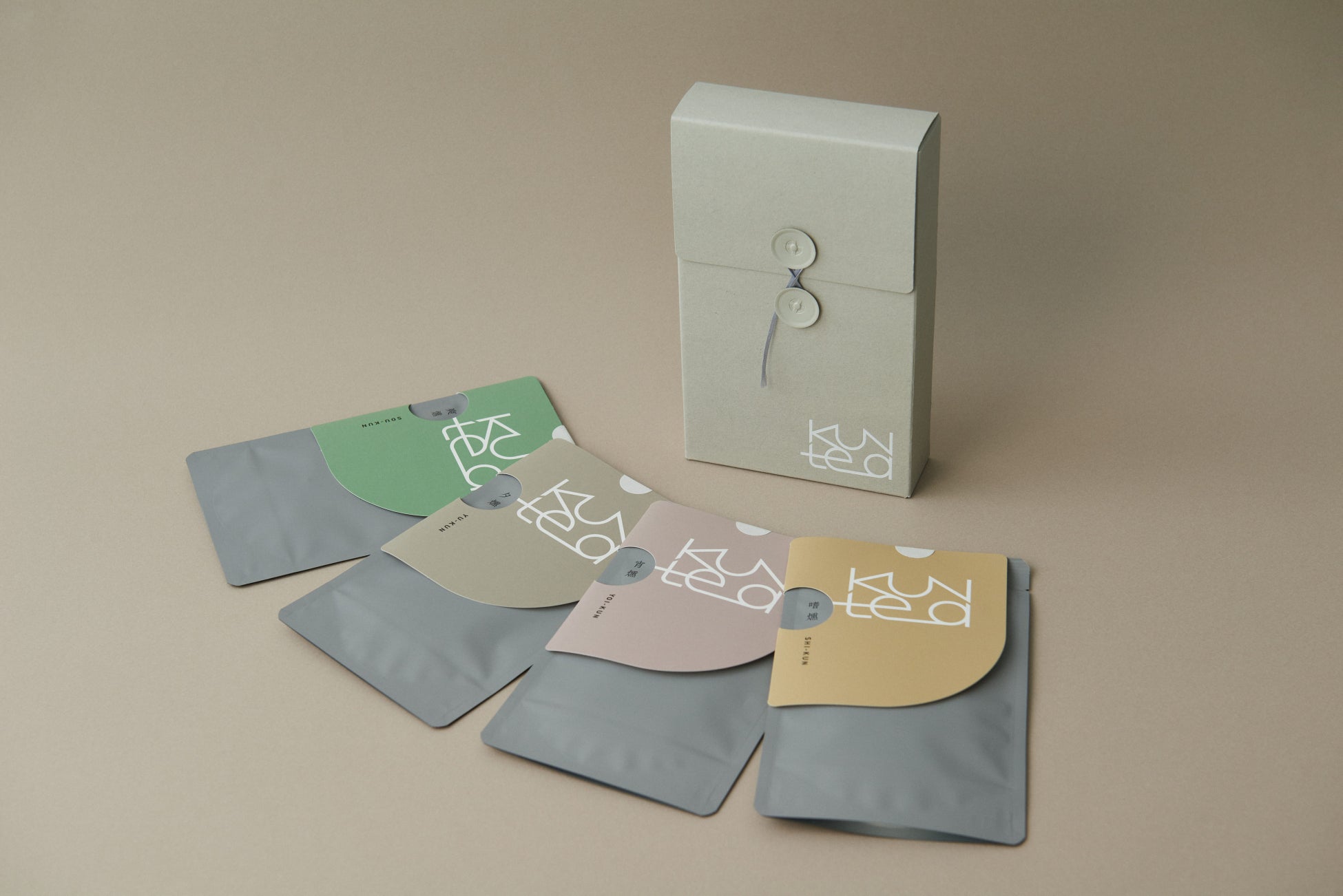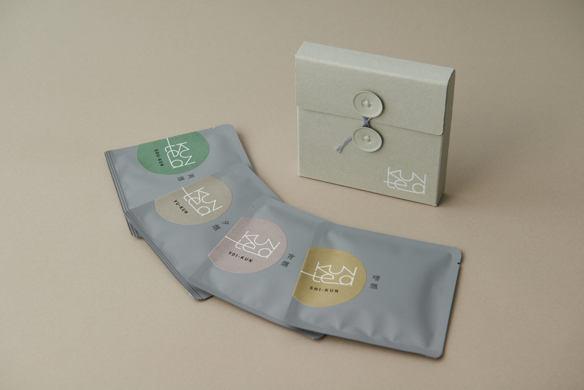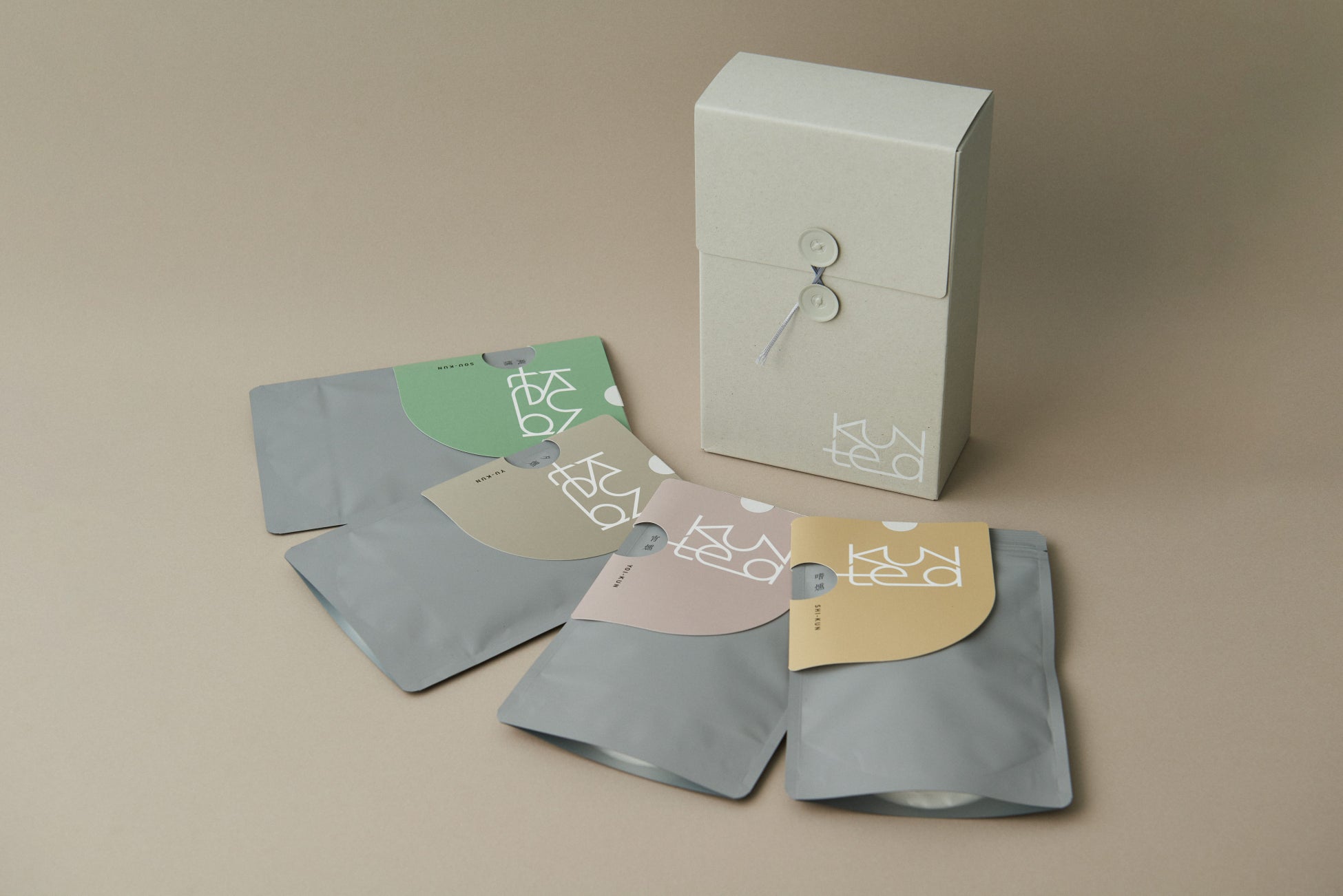 パッケージデザインは、紙の素材にこだわり、軽めのグレーで、燻製のような見えない煙を表現。ミニマルなロゴを配置し、ギフトにふさわしい上質さと、気を遣わせすぎない手軽さの両立を目指しました。また玉紐によって、ギフトを開けるひと手間を楽しみな時間に変換しています。さらに開けたBOXの中には<KUNtea>の世界観を伝えるリーフレット封入するなど細部にまでこだわりました。性別・年齢に限定されない、さまざまな人へお渡しできるギフトBOXです。