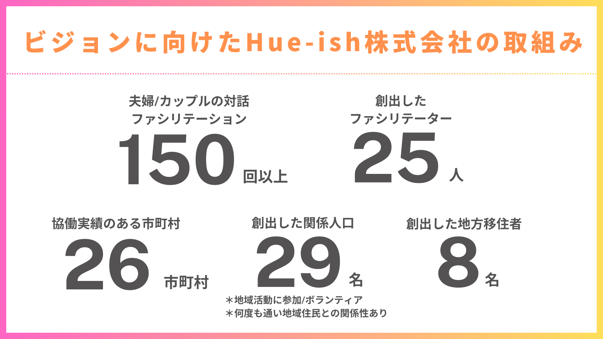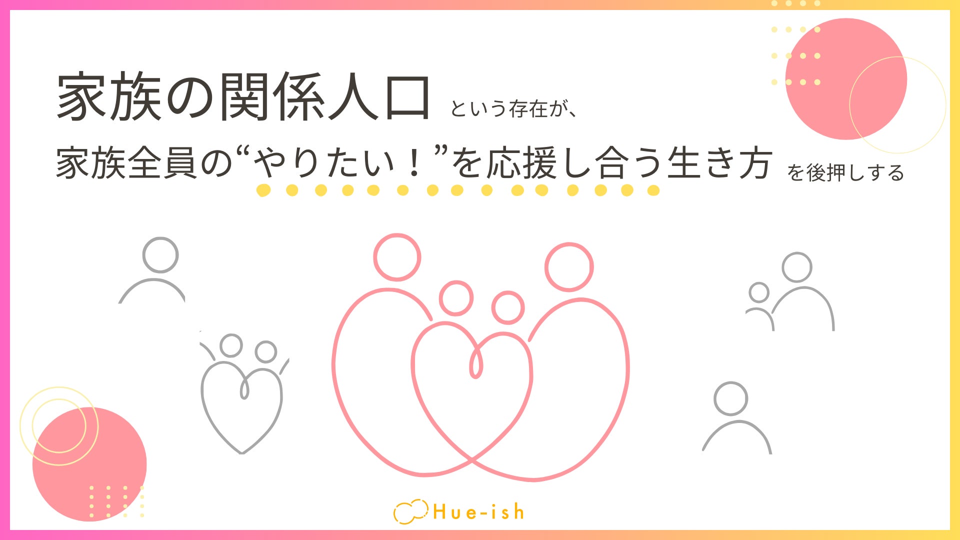 私たちはHue-ish株式会社は、このように家族全員の”やりたい”を応援し合う生き方の後押しをしたいという想いで事業を運営しています。後押しの鍵は、家族の関係人口です。