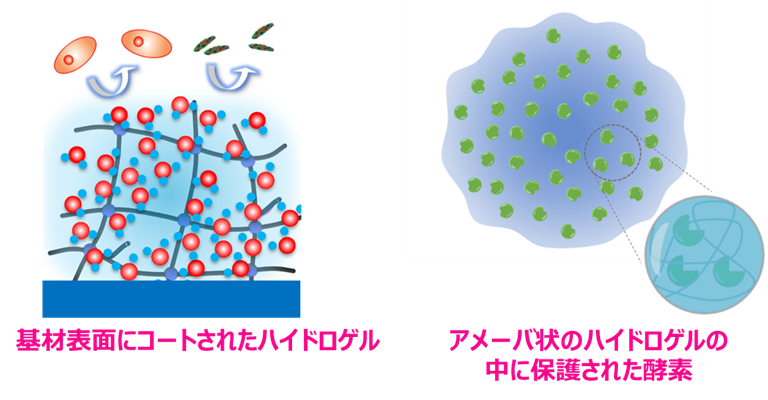 酵素、細胞、臓器などの生体物質は優れた機能を持っていますが、不安定であるために利用できる環境、用途、期間が限定されています。親水性の双性イオンポリマーを基材にコーティングすることによって基材表面に形成される水の保護層が、基材表面へのタンパク質の吸着を抑制し、生体埋め込みデバイスや人工臓器を長期安定化させることが知られていました。