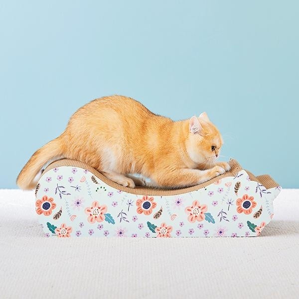 お尻側を少し高くすることで、上に乗るだけで自然と前傾姿勢になり爪とぎをしやすい体勢になるように設計。さらに、ほどよいカーブが体にフィットしくつろぎやすい工夫も。
