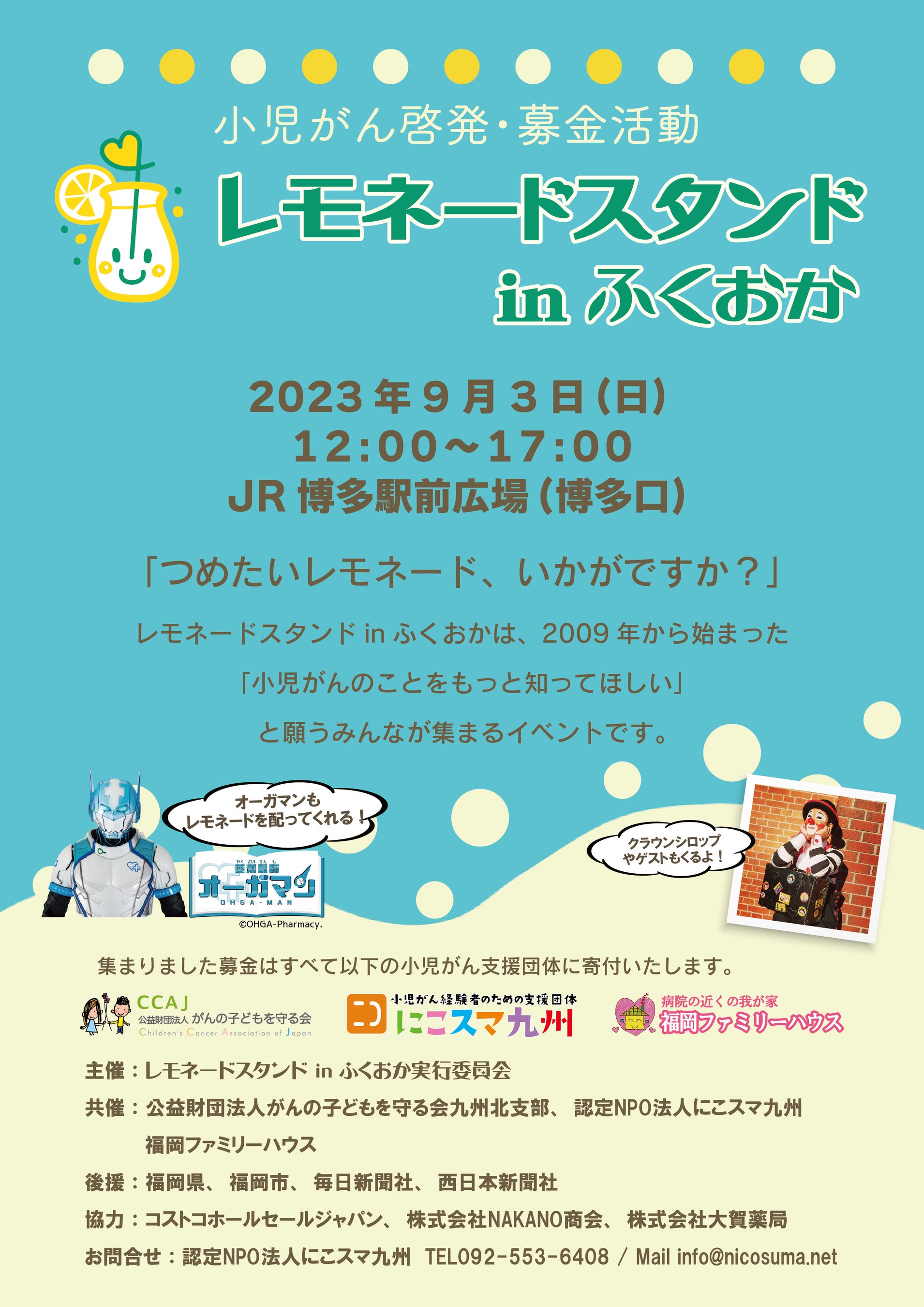 また小児がんの啓発・募金活動としてレモネードスタンドを9月7日(日)に博多駅前広場で開催します。