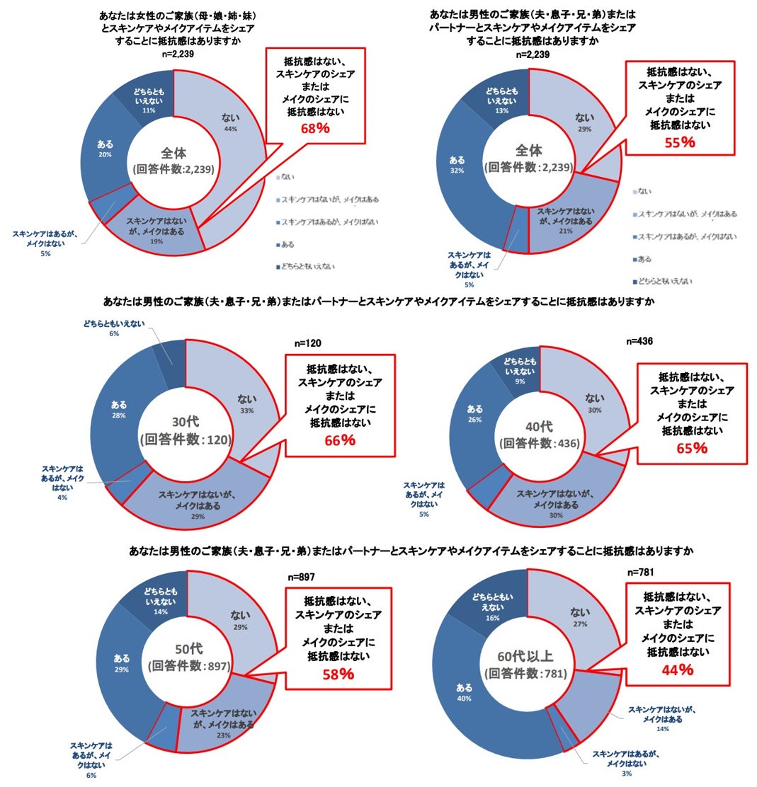 また、男性家族(夫・息子・兄弟)やパートナーとの化粧品シェアでは、「抵抗感はない」29%、「スキンケアはないが、メイクはある」21%、「スキンケアはあるが、メイクはない」5%で、55%の方がシェアに肯定的な結果となった。尚、30代~50代に比べ60代以上の女性は男性家族とのシェアに「抵抗がある」40%と多く、30代~50代は26~29%とシェアに抵抗感が薄い傾向となった。