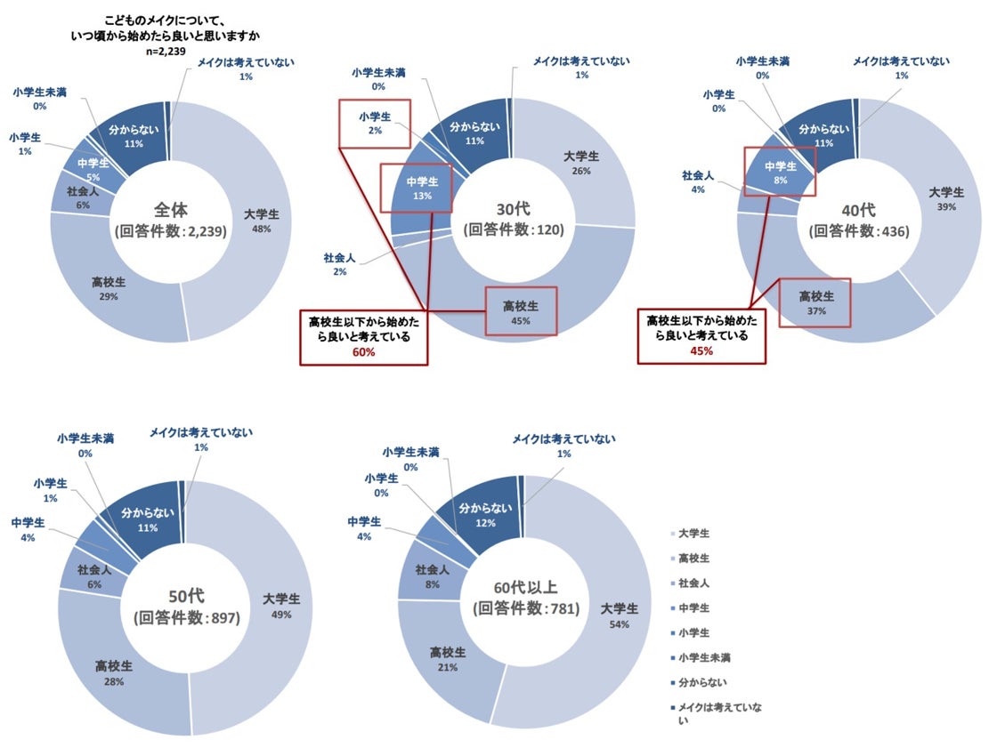 メイクを始める時期は、大学生以上が54%(「大学生」48%、「社会人」6%)、高校生以下が35%(「高校生」29%、「中学生」5%、「小学生」1%)も、30代では高校生以下が60%、40代では45%と大学生以上を上回った。