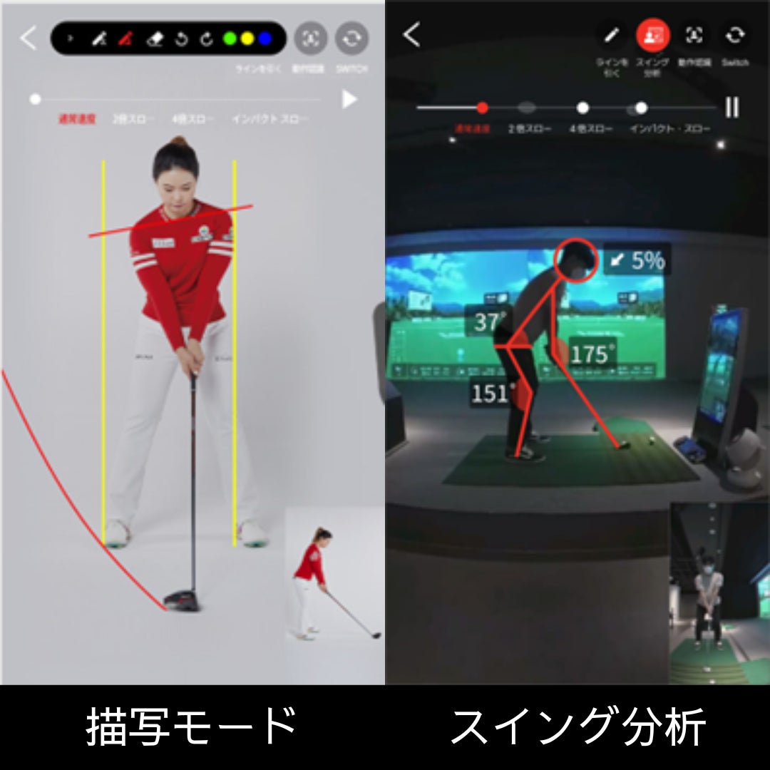 ショット時に自動で録画され、すぐさま自動でガイドライン線を引いてくれる。さらに、「スイング分析機能」を使えば、頭の位置がアドレスから何%動いたのか、サイドカメラから見て手首や腕、膝などの角度をアドレス・トップ・インパクトで表示してくれる。