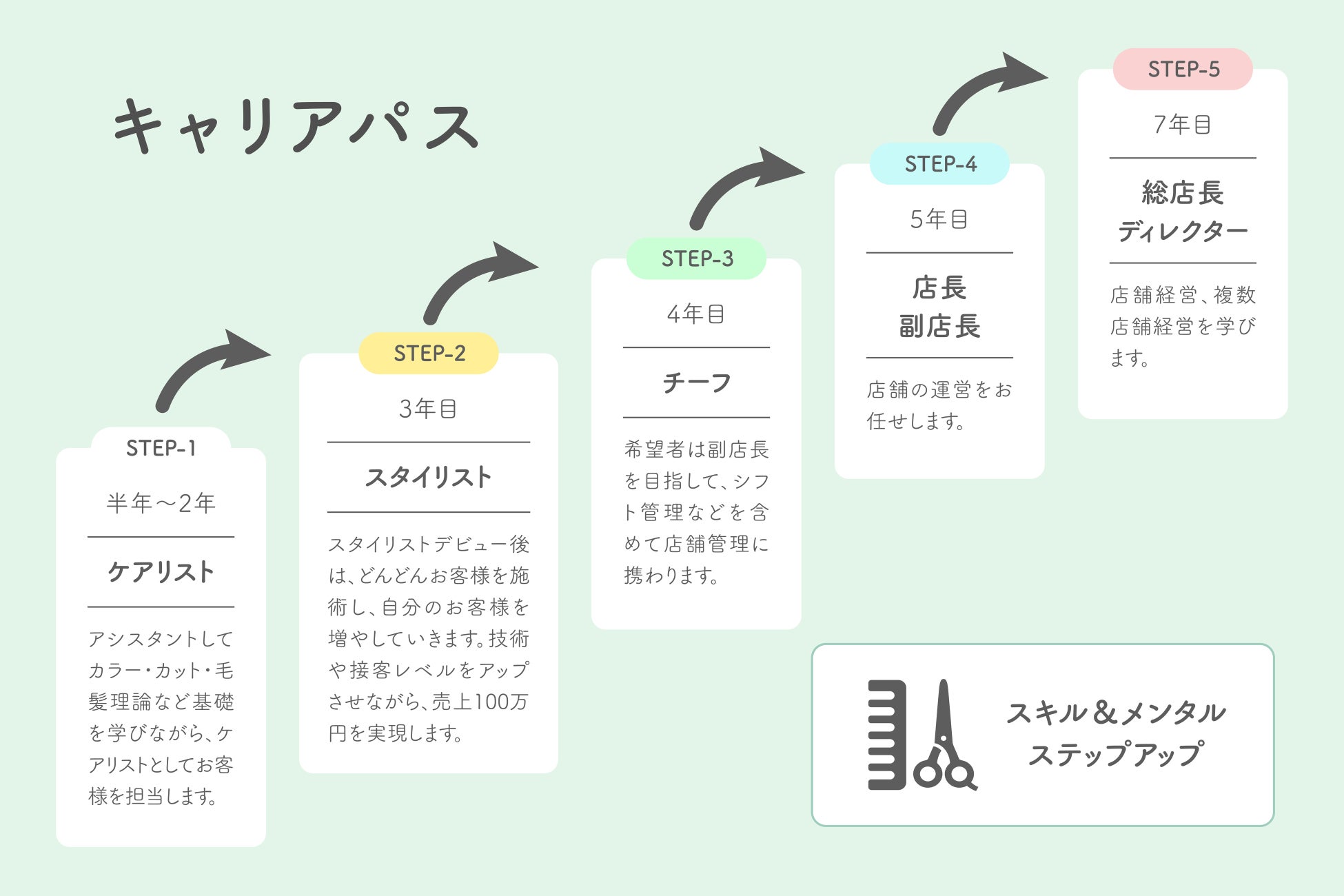 ANCHORグループでは、技術の向上と共に段階的な役職を設けています。基本を学ぶところから、スタイリストデビュー、スタッフ教育、店舗経営等、それぞれのスタッフが次のステップに到達するためにどのような経験を積みどのようなスキルを身につけるのかを明確化することで、モチベーションを持って働くことができます。