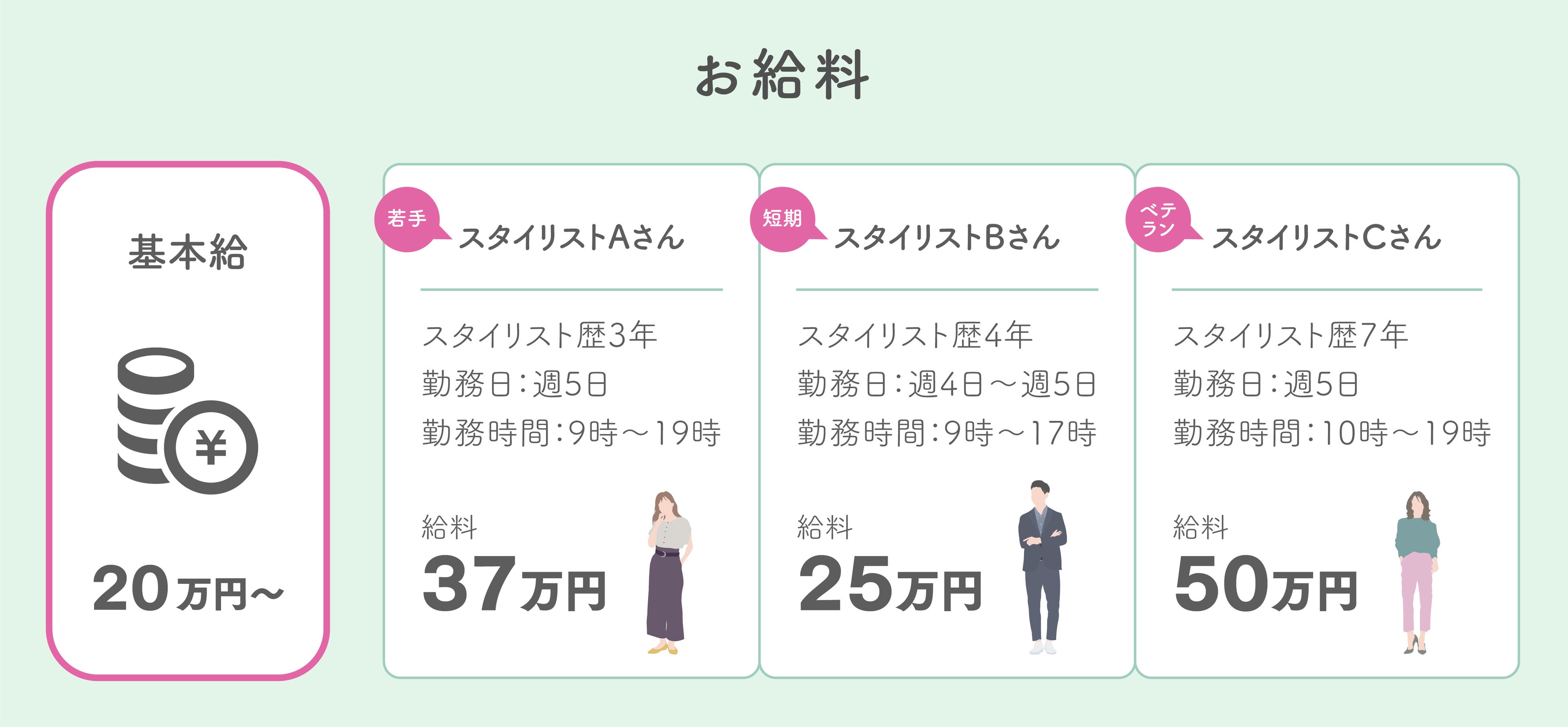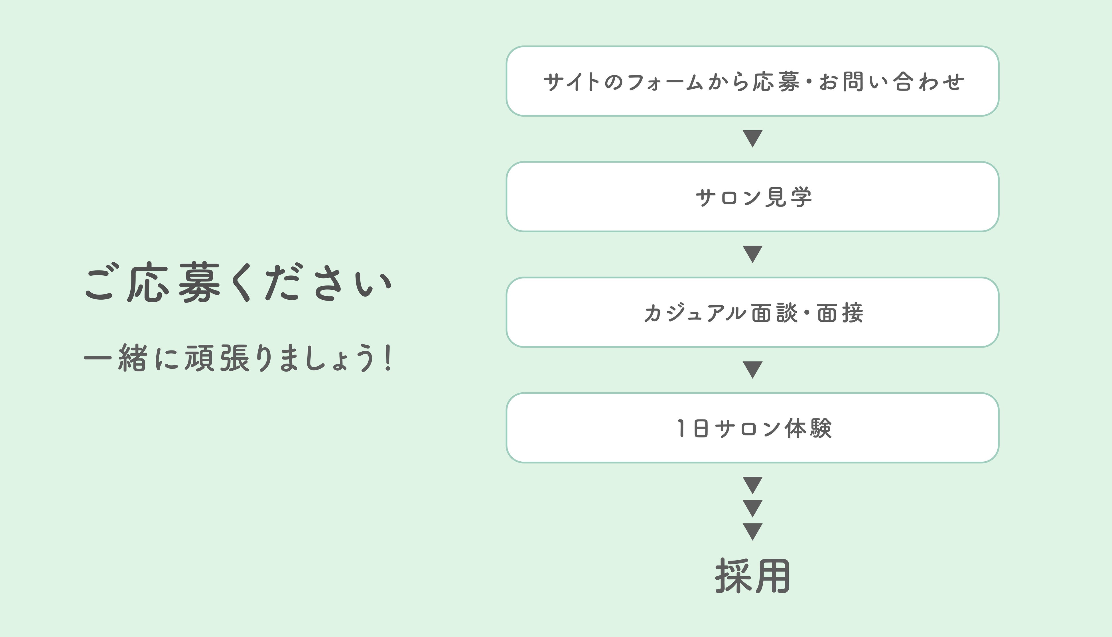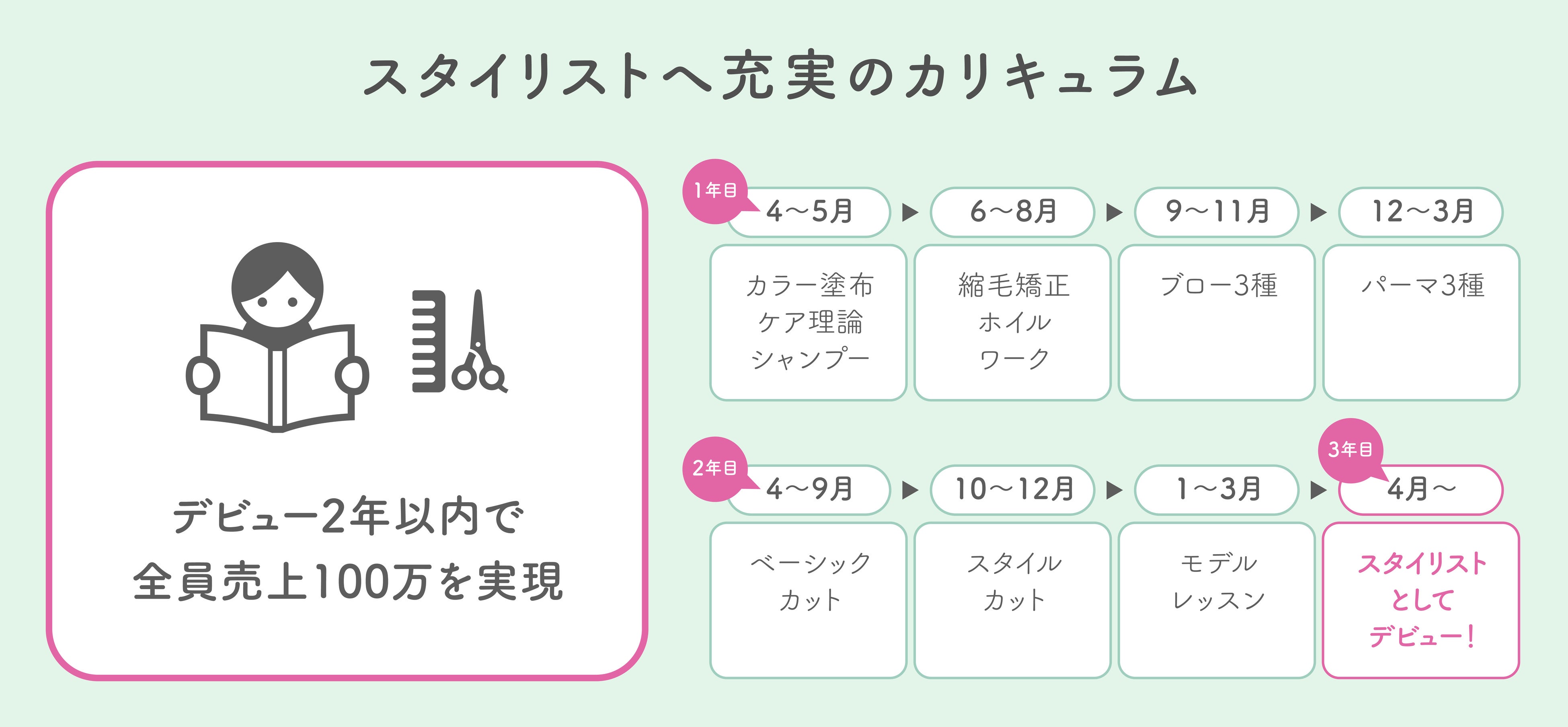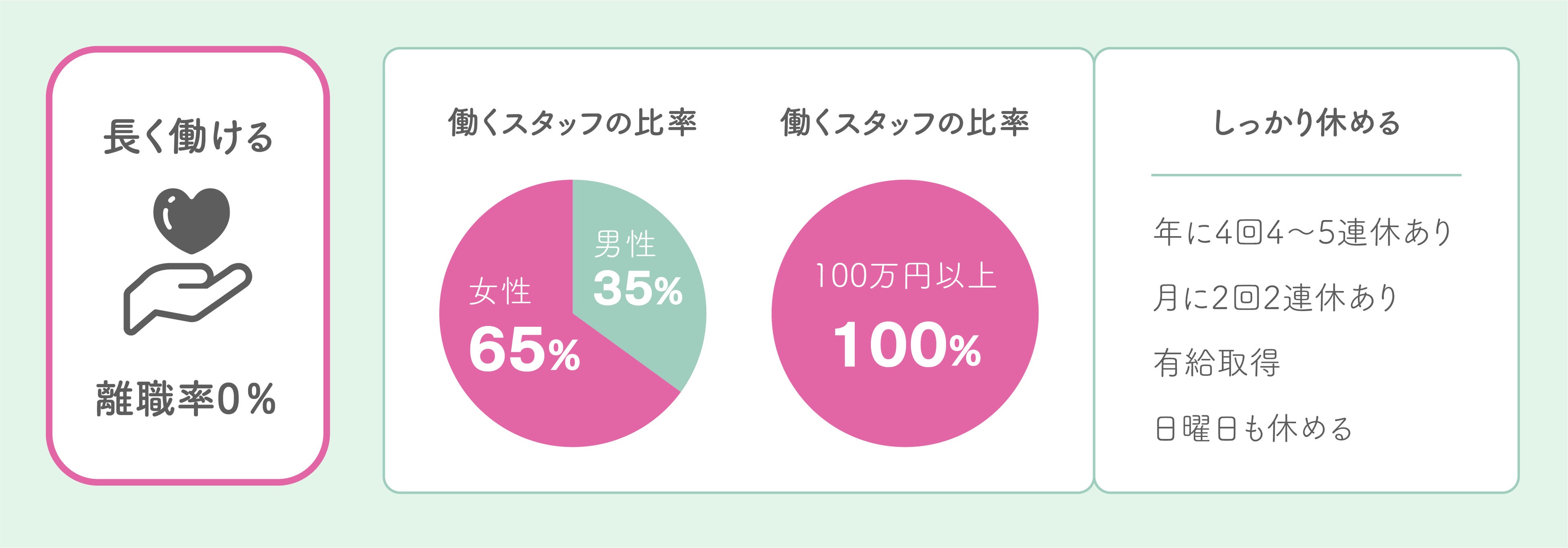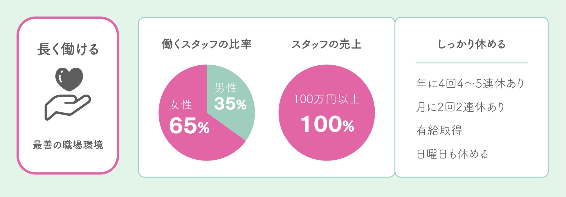 また、美容師の目標ともなる売上100万円を早期に達成することが可能です。全員が100万円を超えており、売上40万円のスタッフが1年以内に100万円に到達した実績もあります。月に2回ある連休や、有給休暇を取得してプライベートも充実させてください。