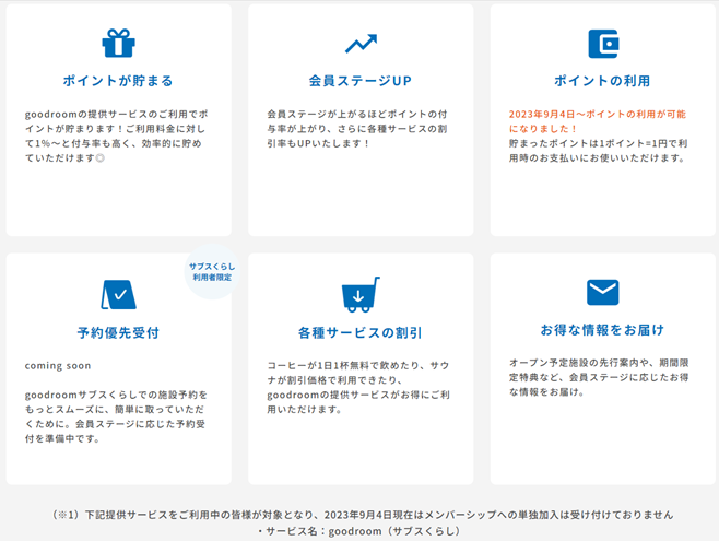 月額980円でさまざまな特典が得られるメンバーシップ制度で、goodroom(サブスくらし)の初回予約時に登録されます。