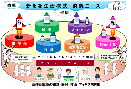 下図のように分科会における各テーマはロケットの発射台に例えられ、各事業者が新たな生活様式・消費ニーズに向けて、ロケット=プロジェクトを創出します。また、行政や関係団体は、燃料(各種支援)をロケットに供給する役割を担います。
